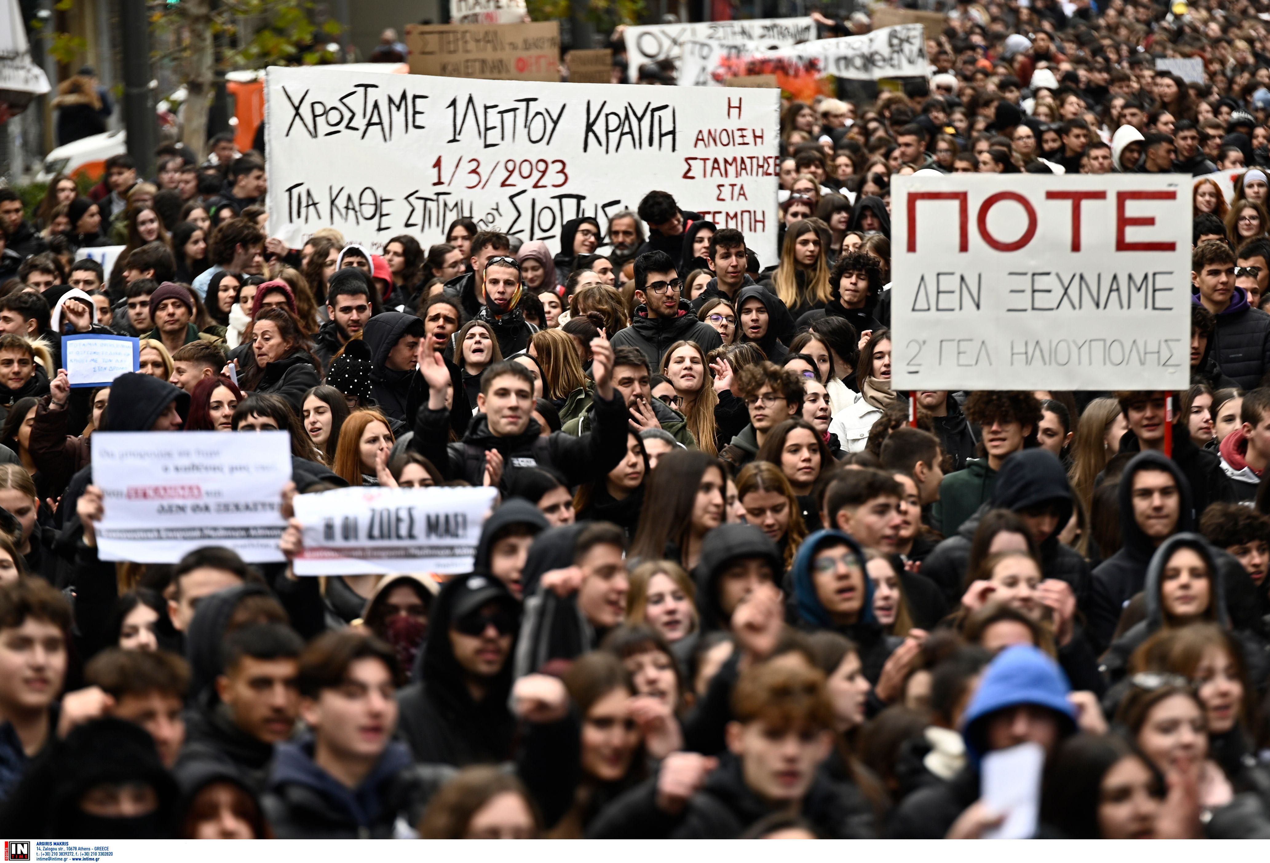 Σύμφωνα με την ΕΡΤ, το κεντρικό σύνθημα των μαθητών είναι «Δεν έχω οξυγόνο» και ζητούν να αποδοθεί δικαιοσύνη για την τραγωδία των Τεμπών.