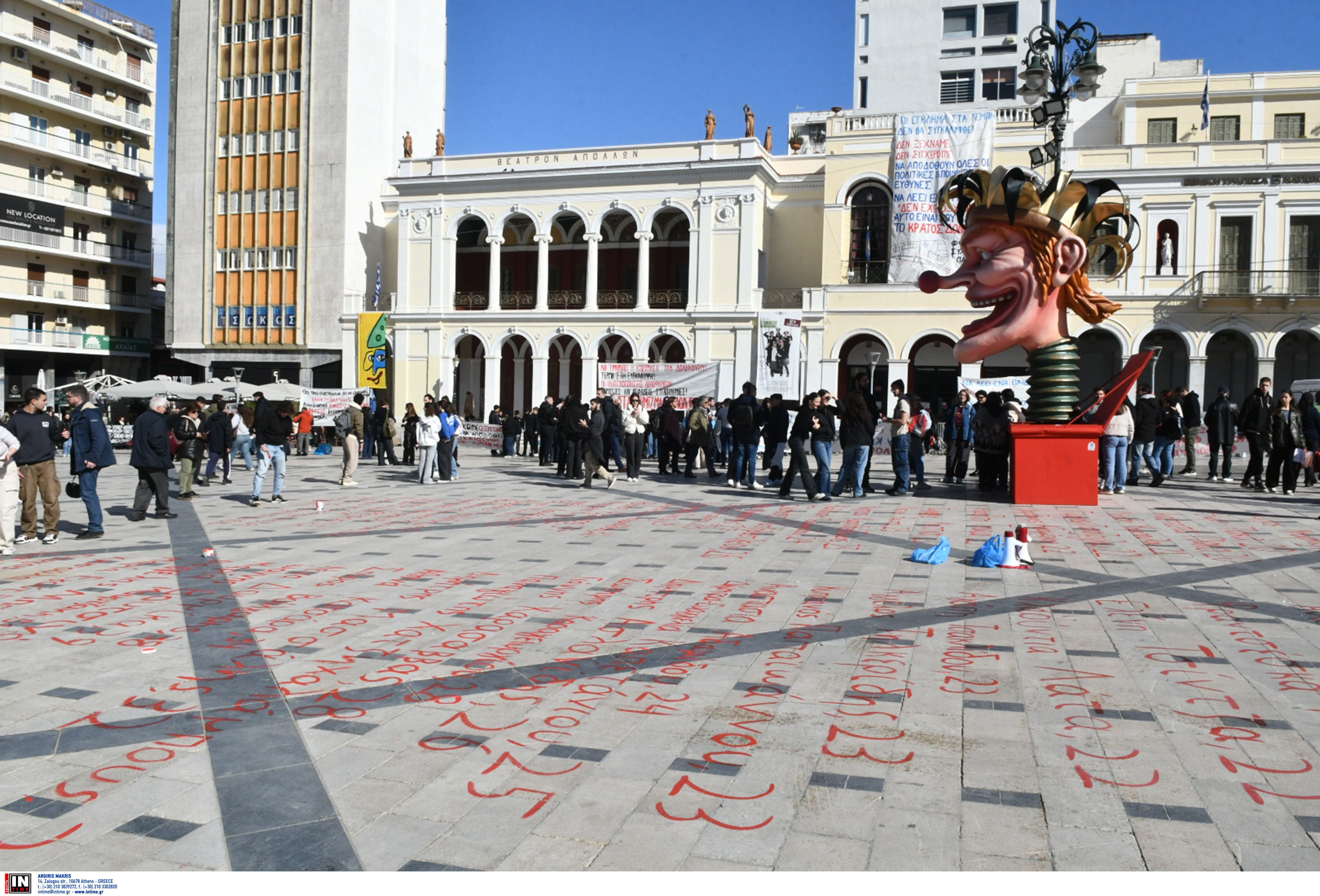 Πανεκπαιδευτικό συλλαλητήριο, με αίτημα την απόδοση δικαιοσύνης για το πολύνεκρο δυστύχημα των Τεμπών, πραγματοποιήθηκε σήμερα το μεσημέρι στην πλατεία Γεωργίου, της Πάτρας. Στο συλλαλητήριο συμμετείχαν φοιτητές, μαθητές, εκπαιδευτικοί, ενώ κατά τη διάρκεια της συγκέντρωσης ανεγράφησαν με κόκκινη μπογιά στην πλατεία Γεωργίου τα ονόματα των θυμάτων της σιδηροδρομικής τραγωδίας.