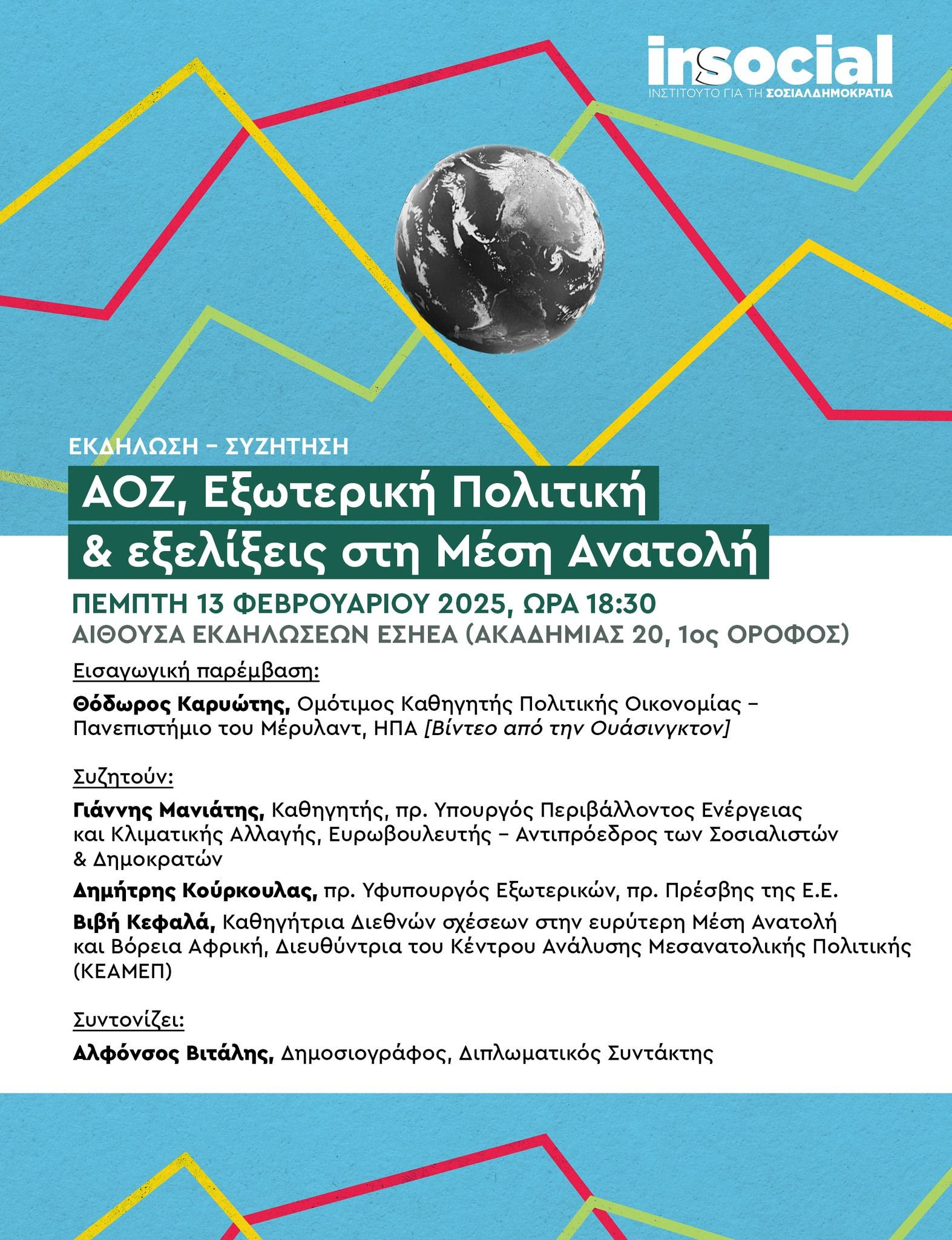 Το Ινστιτούτο για τη Σοσιαλδημοκρατία InSocial διοργανώνει στις 13 Φεβρουαρίου, στις 18:30, μία εκδήλωση-συζήτηση για την ΑΟΖ, την εξωτερική πολιτική και τις εξελίξεις στη Μέση Ανατολή.