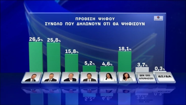 Στην πρόθεση ψήφου, στο σύνολο εκείνων που δηλώνουν ότι θα ψηφίσουν στο ΠΑΣΟΚ, ο Νίκος Ανδρουλάκης προηγείται οριακά με 26,5% έναντι 25,8% του Χάρη Δούκα και 18,1% της Άννας Διαμαντοπούλου.