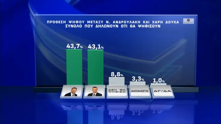 Το απόλυτο ντέρμπι ανάμεσα σε Ανδρουλάκη και Δούκα καταγράφεται στο ερώτημα επί του συνόλου όλων όσοι δηλώνουν ότι θα ψηφίσουν στις κάλπες του ΠΑΣΟΚ. Ο Νίκος Ανδρουλάκης προηγείται με 43,7% έναντι 43,1% του Χάρη Δούκα ενώ οι αναποφάσιστοι είναι στο 3,3%.