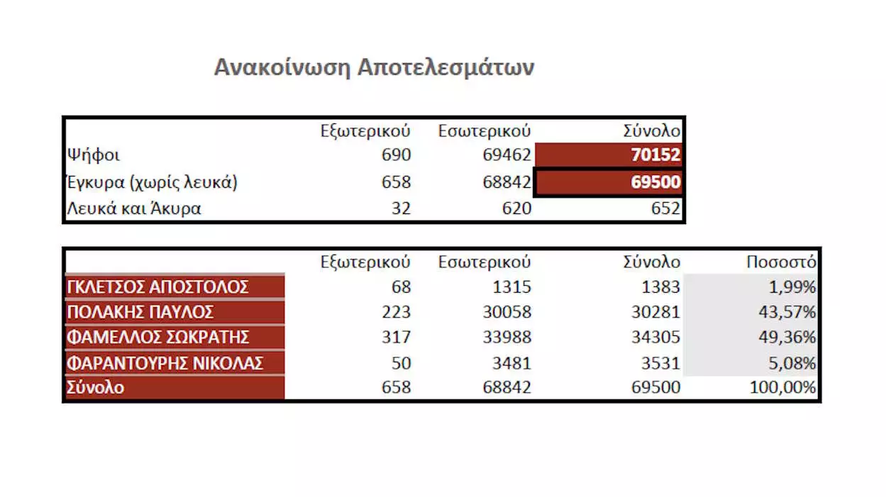 Σημειώνεται ότι στις εκλογές του ΣΥΡΙΖΑ ψήφισαν χθες 70.152 ψηφοφόροι, τα έγκυρα ψηφοδέλτια ήταν 69.500 και τα άκυρα 652, ενώ η διαφορά των ψήφων των Σωκράτη Φάμελλου και Παύλου Πολάκη ήταν 4.024.
