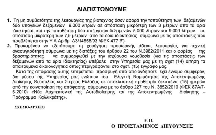 Οι δεξαμενές προπανίου που βρίσκονται στην μικρότερη απόσταση απ’ ότι πρέπει από τα όρια της ιδιοκτησίας, όπως παρατήρησε και η Περιφέρεια το 2020