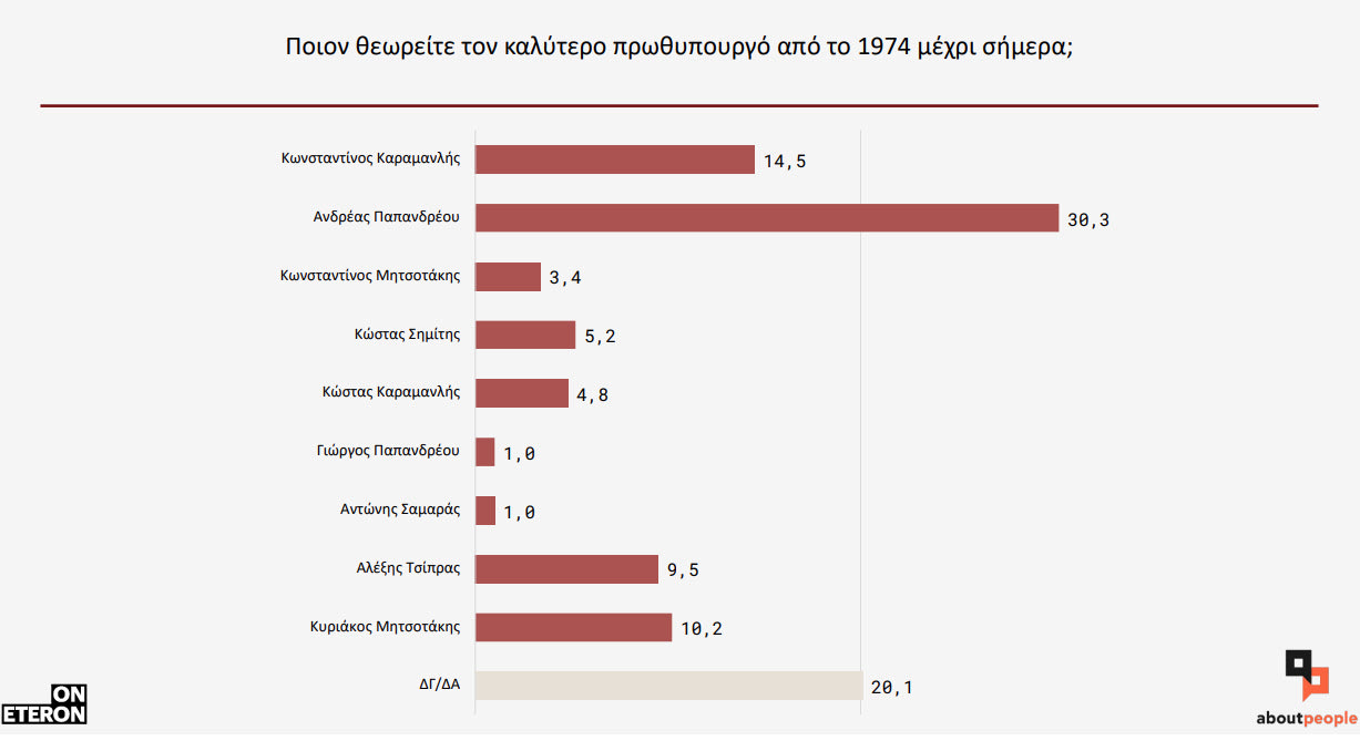 Στην έρευνα του ινστιτούτου ερευνών Eteron, ο Ανδρέας Παπανδρέου αξιολογείται ως ο καλύτερος πρωθυπουργός από το 30,3%, των ερωτηθέντων, ενώ ακολουθεί ο ιδρυτής της ΝΔ, ο άλλος μεγάλος πολιτικός της μεταπολίτευσης Κωνσταντίνος Καραμανλής, με ποσοστό 14,3%.