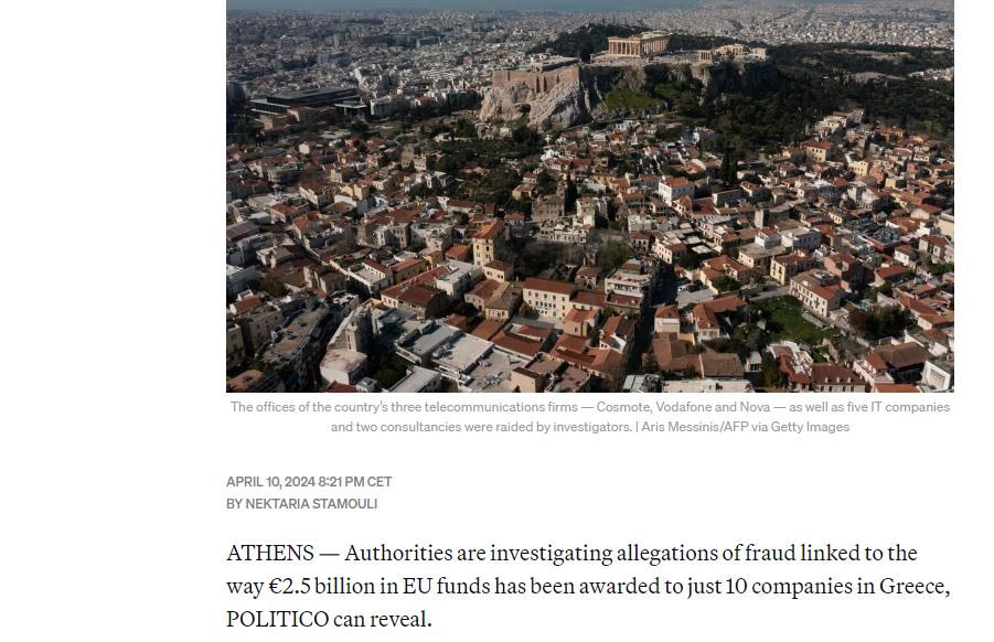Σύμφωνα με το ρεπορτάζ της Νεκταρίας Σταμούλη για το Politico, οι αρχές ερευνούν καταγγελίες για απάτη που συνδέεται με τον τρόπο που χορηγήθηκαν κονδύλια της ΕΕ ύψους 2,5 δισεκατομμυρίων ευρώ σε μόλις 10 εταιρείες στην Ελλάδα, με την Ευρωπαϊκή Εισαγγελία να επιβεβαιώνει ότι έχει ξεκινήσει έρευνα.