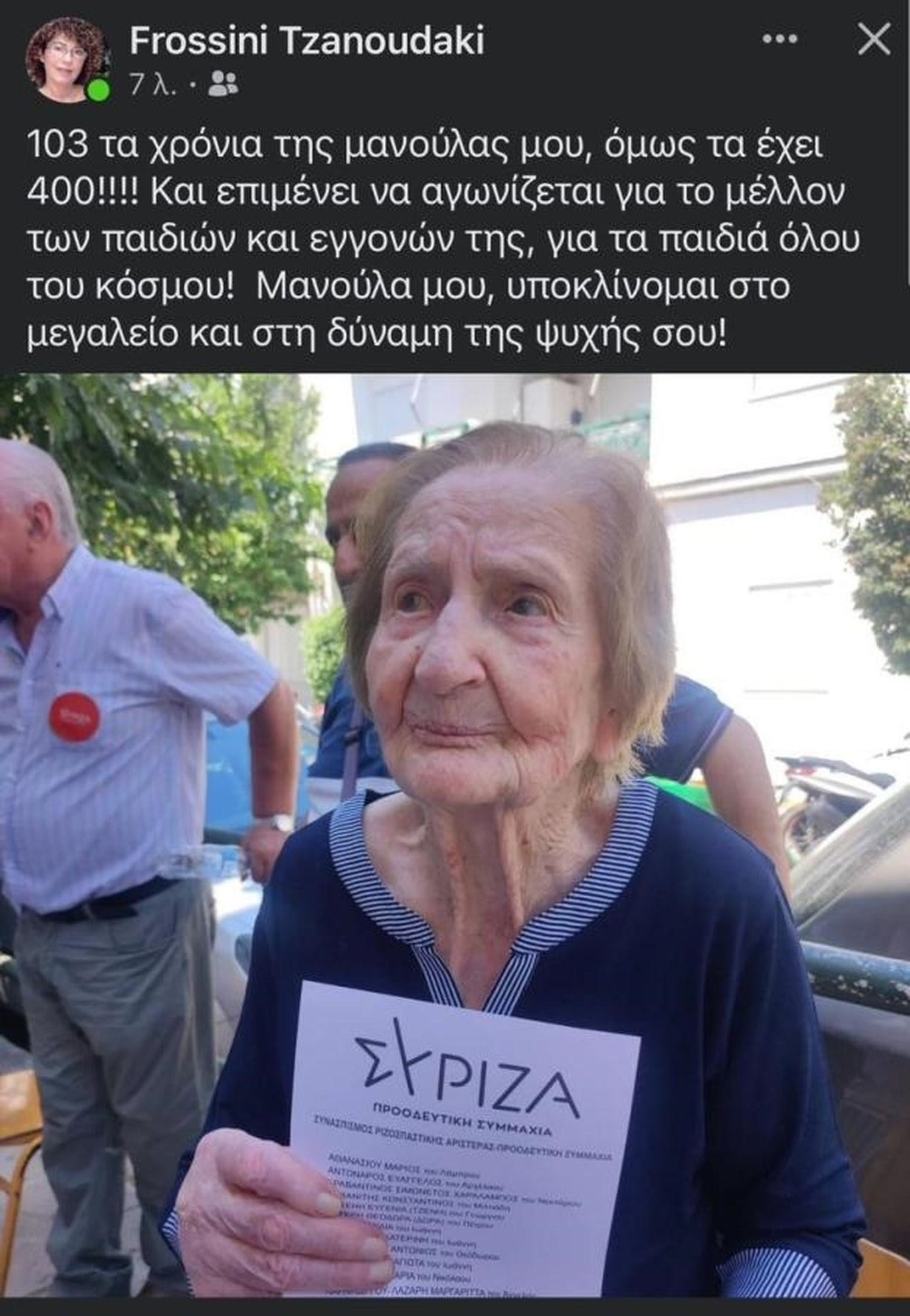 “103 τα χρόνια της μανούλας μου, όμως τα έχει 400 !!!! Και επιμένει να αγωνίζεται για το μέλλον των παιδιών και εγγονών της, για τα παιδιά όλου του κόσμου! Μανούλα μου, υποκλίνομαι στο μεγαλείο και στη δύναμη της ψυχής σου!”.
