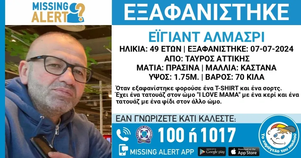 Αναλυτικότερα, εκδόθηκε Missing Alert από το «Χαμόγελο του Παιδιού» για τον Αλμασρί Εϊγιάντ, 49 ετών ο οποίος εξαφανίστηκε στις 07/07/2024, στις 12:00 το μεσημέρι, από την περιοχή του Ταύρου Αττικής.