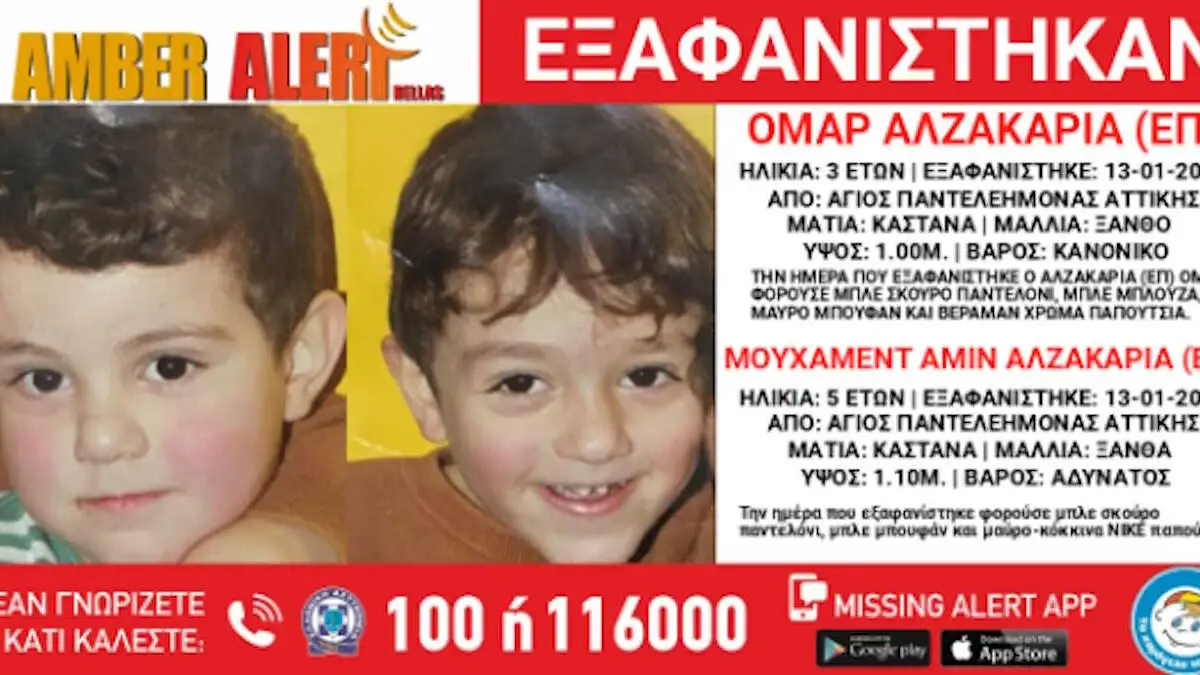 Μία διπλή εξαφάνιση μικρών παιδιών από τον Άγιο Παντελεήμονα Αττικής σήμανε συναγερμό στις αρχές. Πρόκειται για τον Ομάρ Αλζακαρία 3 ετών και τον Μουχάμεντ Αμίν Αλζακαρία 5 χρόνων, όπως ανακοίνωσε την Τετάρτη (22.01.2025) το «Χαμόγελο του Παιδιού».