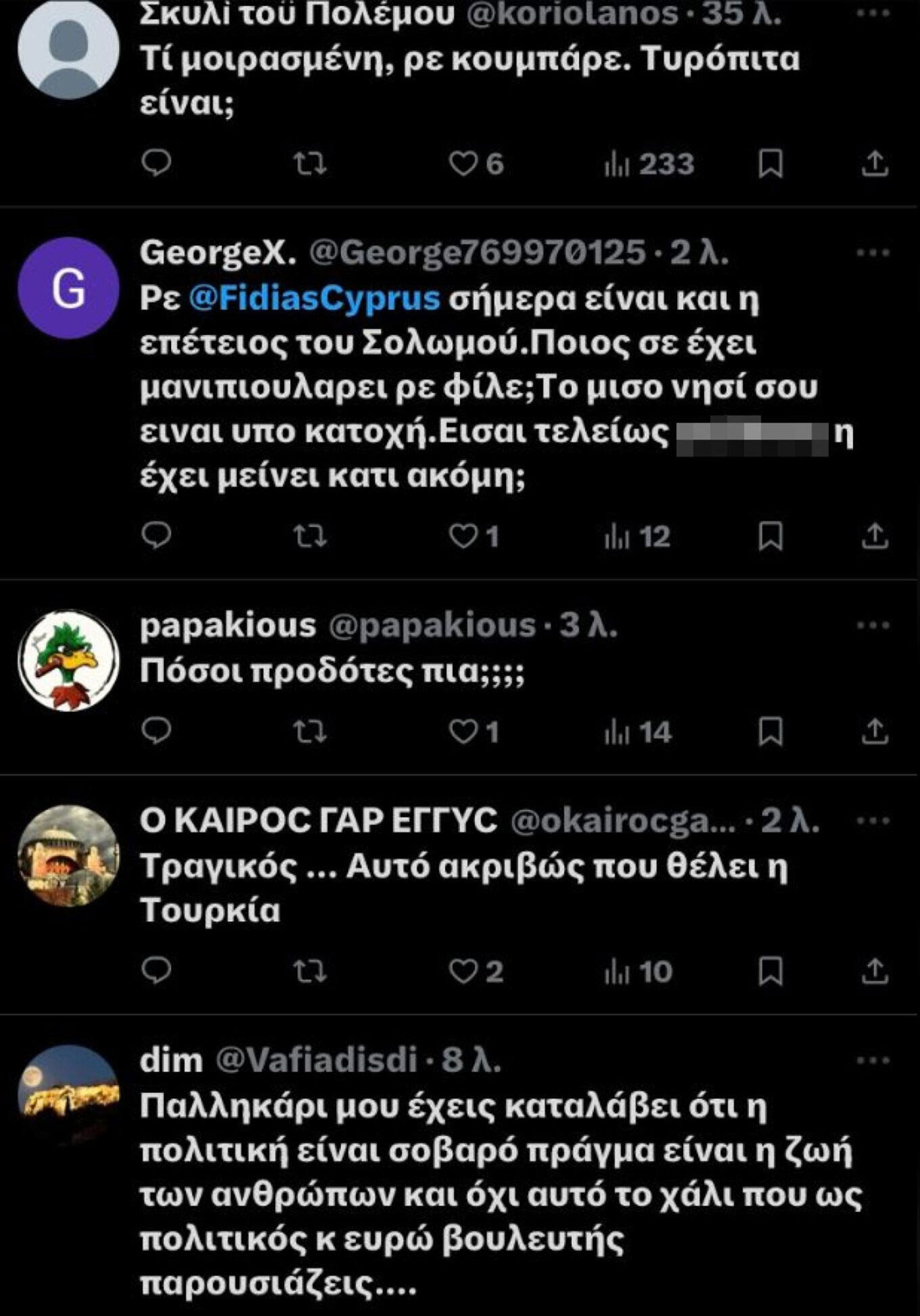 Κάποιοι χαρακτήρισαν τον Φειδία Παναγιώτου «προδότη» και ότι αυτό που κάνει είναι «κατάντια» ενώ άλλοι έσπευσαν να τον συγχαρούν που δείχνει «κάτι άλλο» και «προχωρά μπροστά».