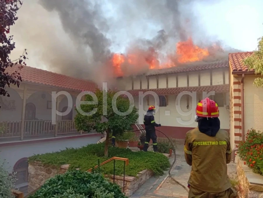 Στις φλόγες βρίσκεται η Ιερά Μονή Αγίου Νικολάου στο Μπάλα Πατρών, με την καταστροφική πυρκαγιά να καίει τη σκεπή του γυναικείου μοναστηριού.
