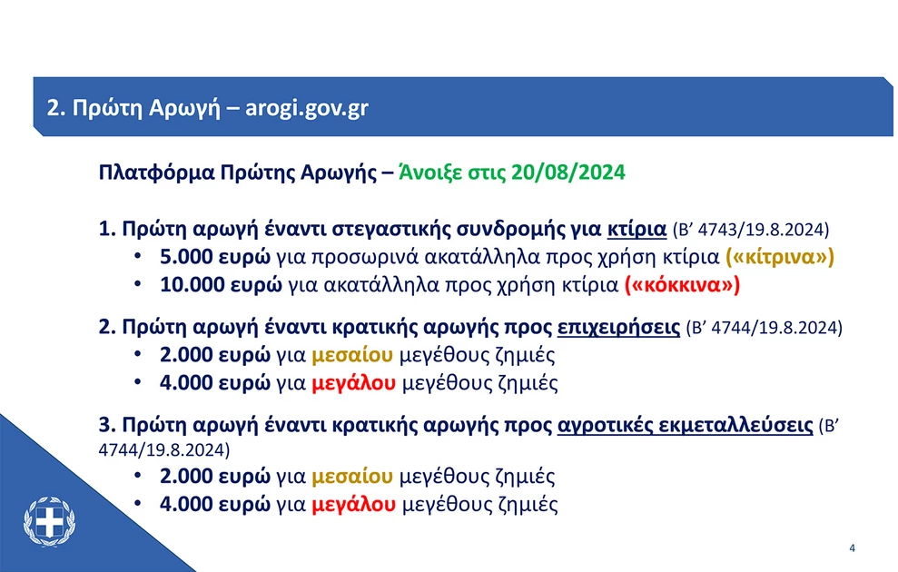 Από σήμερα, Τρίτη, 20/8/2024, έχει ανοίξει η πλατφόρμα για την υποβολή δηλώσεων πρώτης αρωγής από τους πολίτες και τις επιχειρήσεις που έχουν υποστεί ζημιές σε κατοικίες και επαγγελματικούς χώρους.