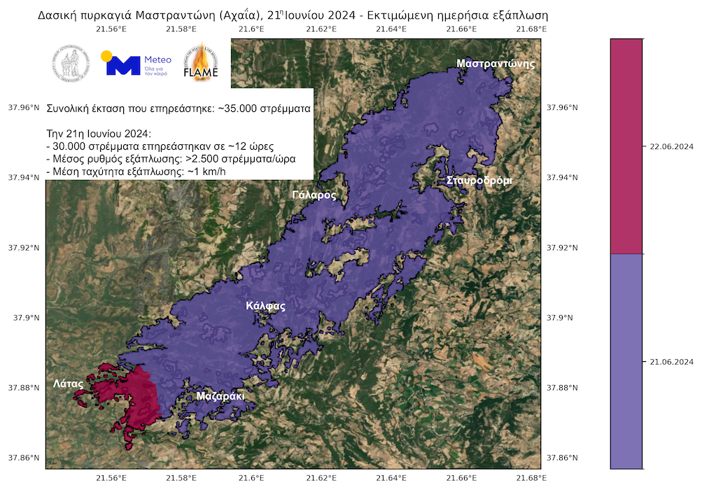 Πολύ μεγάλη είναι η καταστροφή που άφησε πίσω της η φωτιά στην Αχαΐα που ξεκίνησε από την περιοχή Μαστραντώνης την 21.06.2024, όπως προκύπτει με βάση προκαταρκτική ανάλυση δορυφορικών δεδομένων (Εικόνα 1) που πραγματοποίησε η Πυρομετεωρολογική Ομάδα FLAME της μονάδας ΜΕΤΕΟ του Εθνικού Αστεροσκοπείου Αθηνών (ΕΑΑ).
