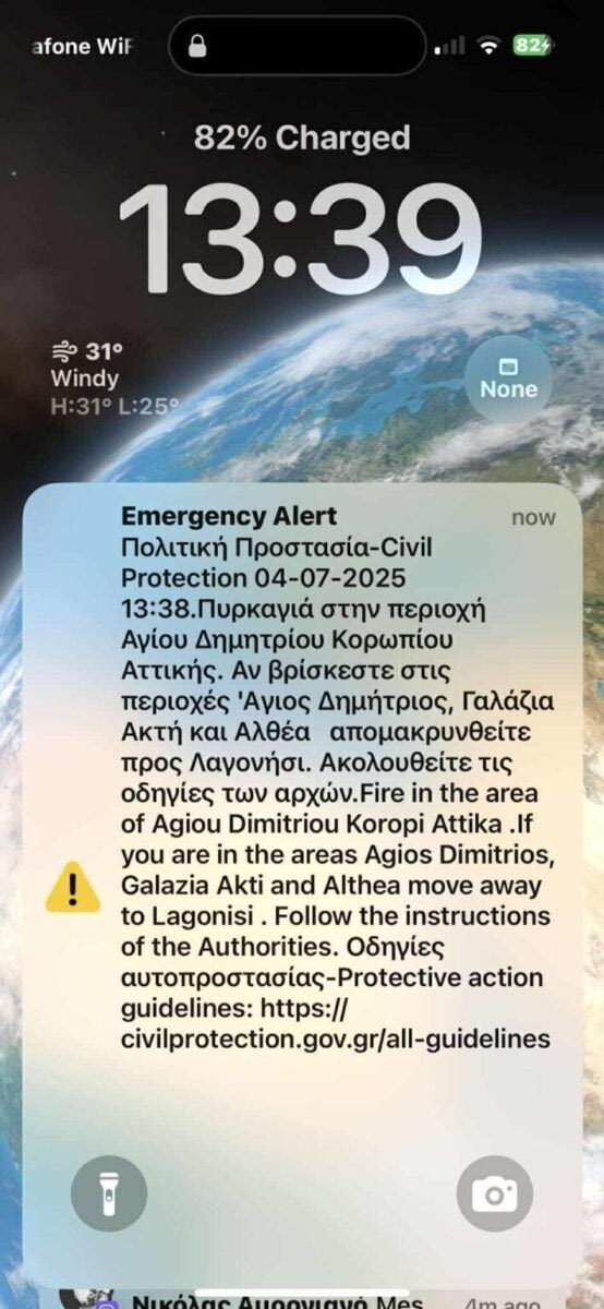 Φωτιά ξέσπασε σε χαμηλή βλάστηση στην περιοχή Άγιος Δημήτριος στο Κορωπί το μεσημέρι της Παρασκευής (4.7.25). Από το 112 εστάλη μήνυμα προς τους κατοίκους της περιοχής να απομακρυνθούν προς Λαγονήσι.