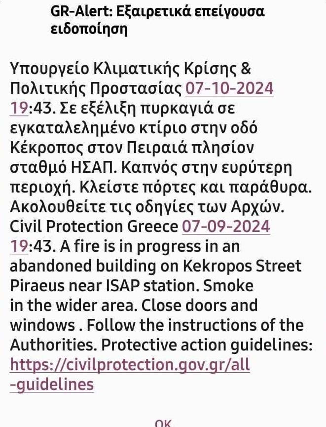 Μάλιστα πριν από λίγα λεπτά εστάλη μήνυμα του 112 στους κατοίκους της περιοχής. «Σε εξέλιξη πυρκαγιά σε εγκαταλελειμμένο κτίριο στην οδός Κέκροπός στον Πειραιά πλησίον σταθμού ΗΣΑΠ. Καπνός στην ευρύτερη περιοχή. Κλείστε πόρτες και παράθυρα. Ακολουθείτε τις οδηγίες των Αρχών» αναφέρει το μήνυμα του 112.
