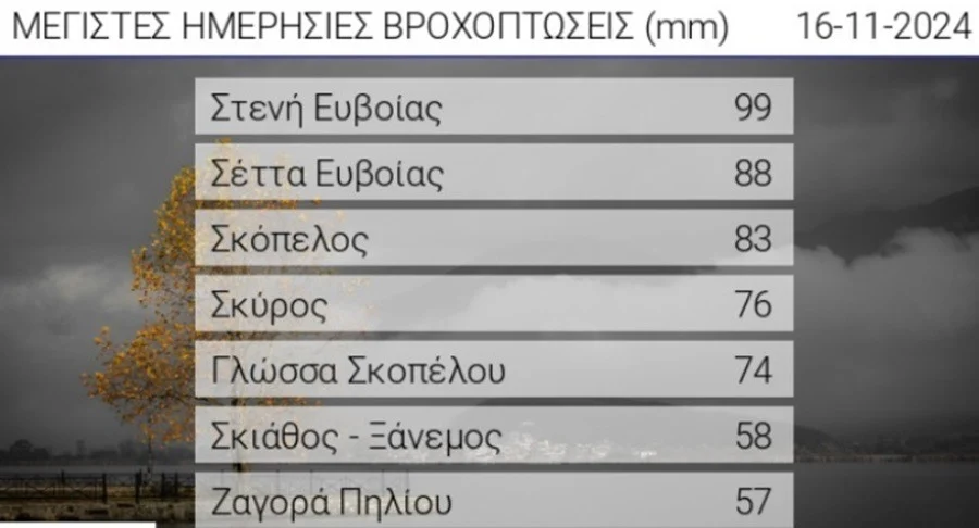 Τα 8 μεγαλύτερα ύψη βροχόπτωσης έως τις 12:00 το μεσημέρι του Σαββάτου καταγράφηκαν σε Στενή Ευβοίας, Σέττα Ευβοίας, Σκόπελο, Σκύρο, Γλώσσα Σκοπέλου, Σκιάθο-Ξάνεμο, Ζαγορά Πηλίου και Σκιάθο.