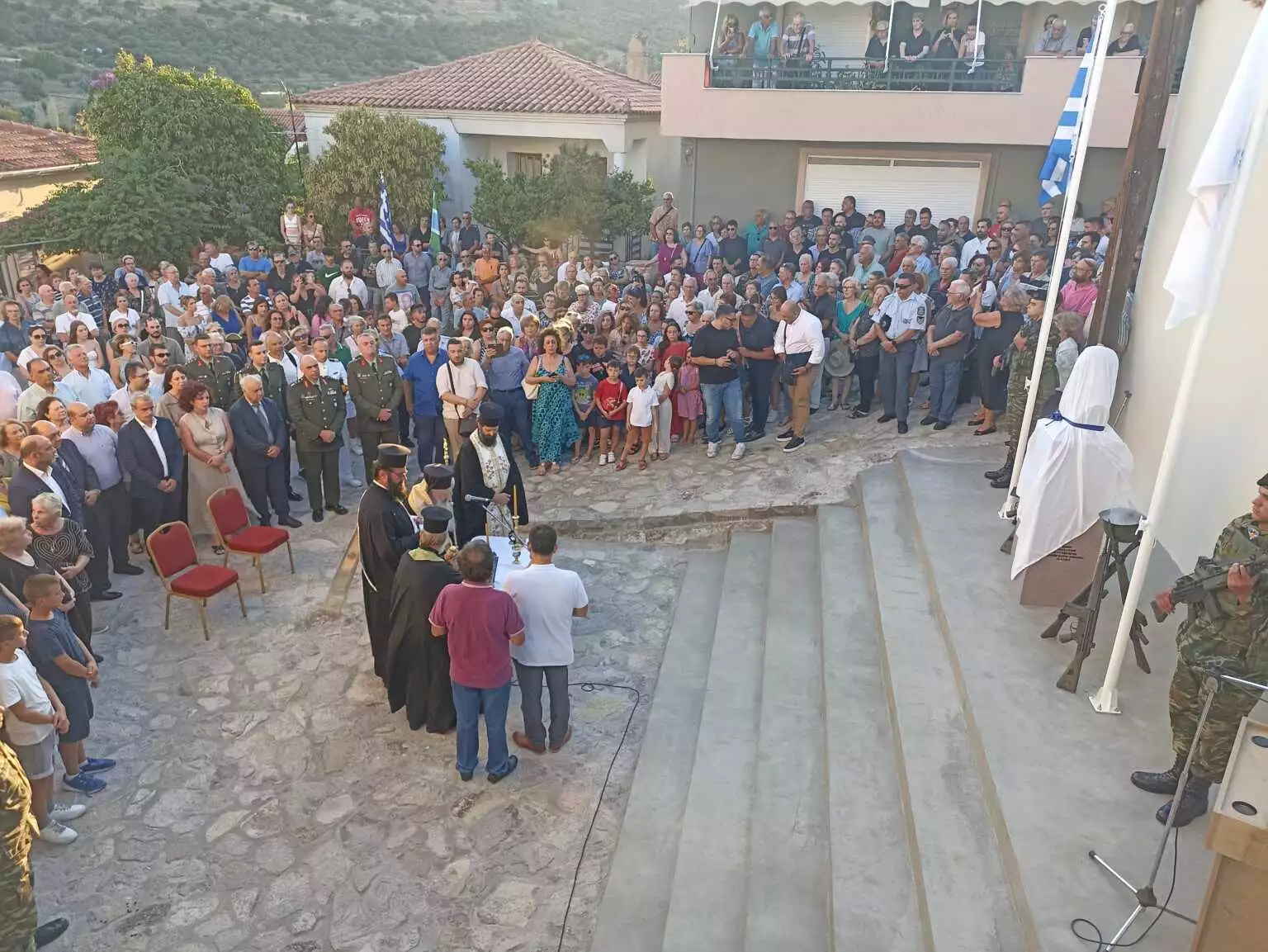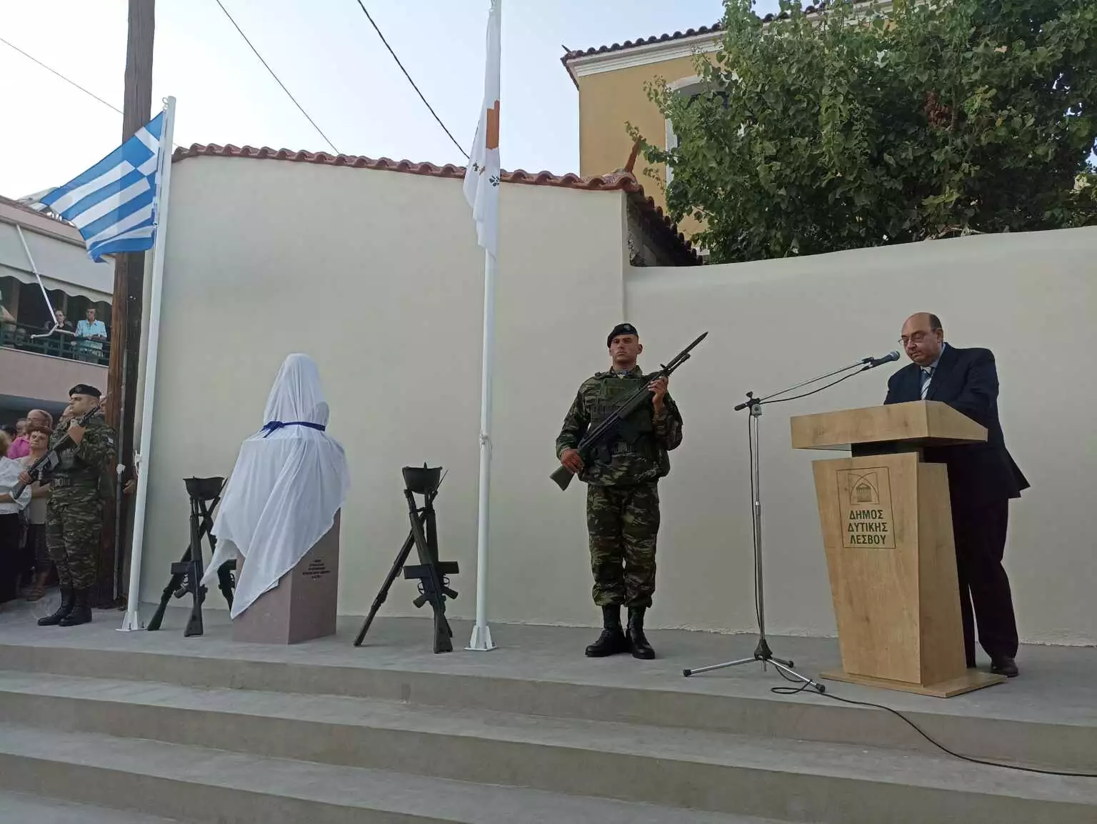 Στο χαιρετισμό του ο δήμαρχος Δυτικής Λέσβου Ταξιάρχης Βέρρος σημείωσε μεταξύ των άλλων: «Πώς αλήθεια, μια στιγμή διχασμού στην ιστορία ενός τόπου, μπορεί να φέρει μισό αιώνα κατοχής, προσφυγιάς, ξεριζωμού, πόνου; Πώς μια τραγική επιλογή διχασμού, μια παρέκκλιση από τις δημοκρατικές αξίες μπορεί να σπείρει τον όλεθρο και την καταστροφή; Να παραδώσει μισή πατρίδα στα βάρβαρα και αιματοβαμμένα χέρια του Αττίλα;