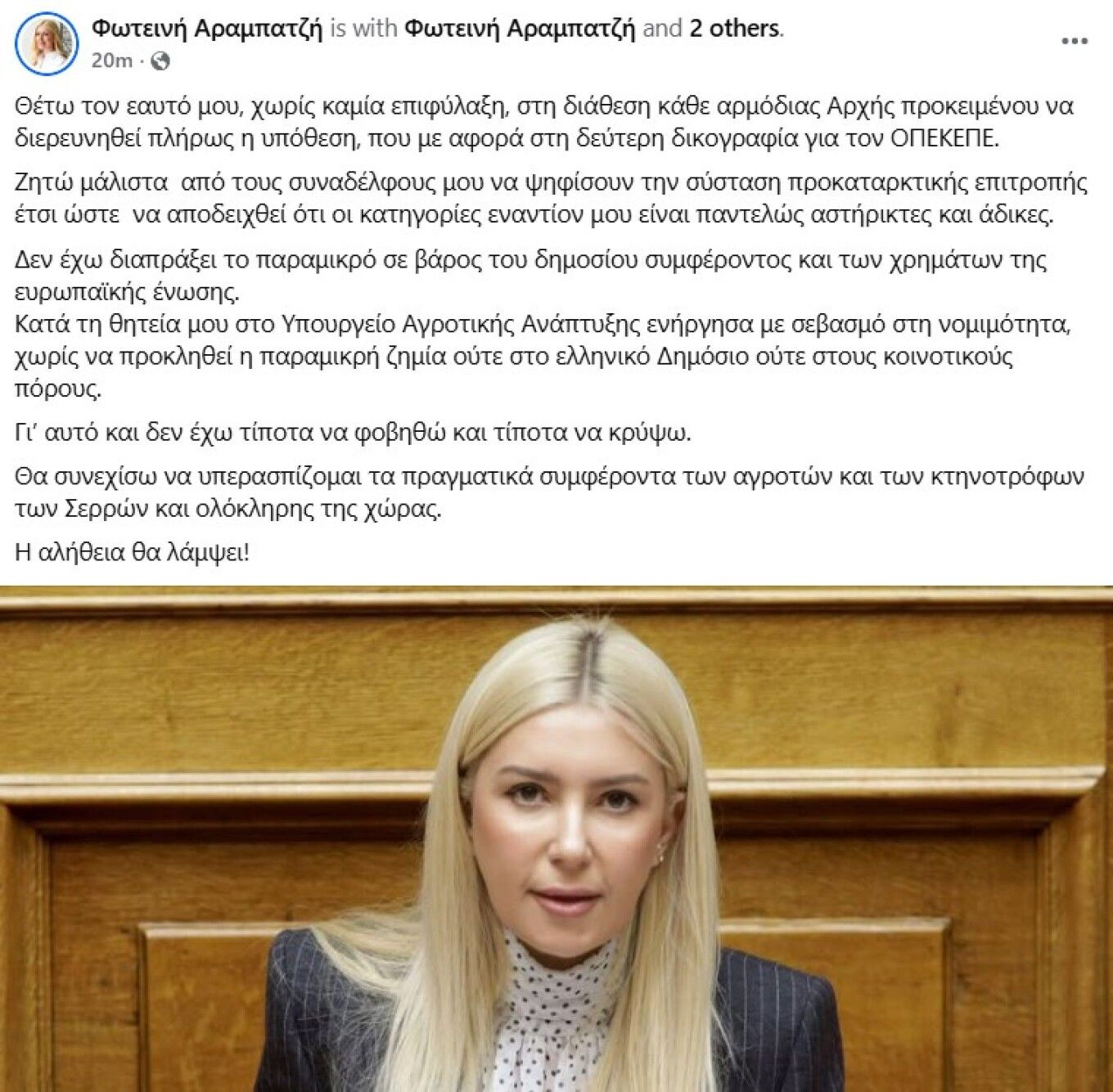 Σε ανάρτησή της στα social media για τη δεύτερη δικογραφία που αφορά τον ΟΠΕΚΕΠΕ, η βουλευτής της ΝΔ Φωτεινή Αραμπατζή δηλώνει ότι θέτει τον εαυτό της στη διάθεση των αρμόδιων αρχών και ζητά τη σύσταση προκαταρκτικής επιτροπής, προκειμένου – όπως αναφέρει – να αποδειχθεί ότι οι κατηγορίες σε βάρος της είναι αβάσιμες. Τονίζει ότι κατά τη θητεία της στο υπουργείο Αγροτικής Ανάπτυξης ενήργησε με πλήρη σεβασμό στη νομιμότητα και υποστηρίζει ότι δεν έχει προκληθεί ζημία στο Δημόσιο ή σε ευρωπαϊκούς πόρους.