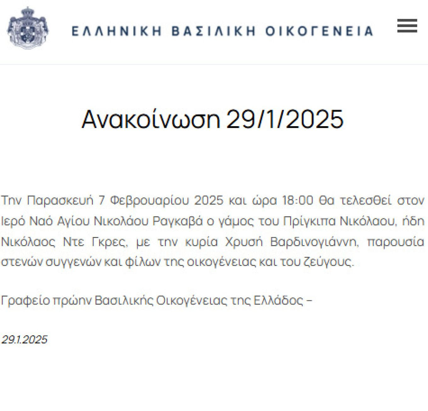 Με μια λιτή ανακοίνωση που αναρτήθηκε στην ιστοσελίδα της πρώην βασιλικής οικογένειας της Ελλάδας, επισημοποιήθηκε η είδηση του επικείμενου γάμου του Νικολάου Ντε Γκρες με την Χρυσή Βαρδινογιάννη.
