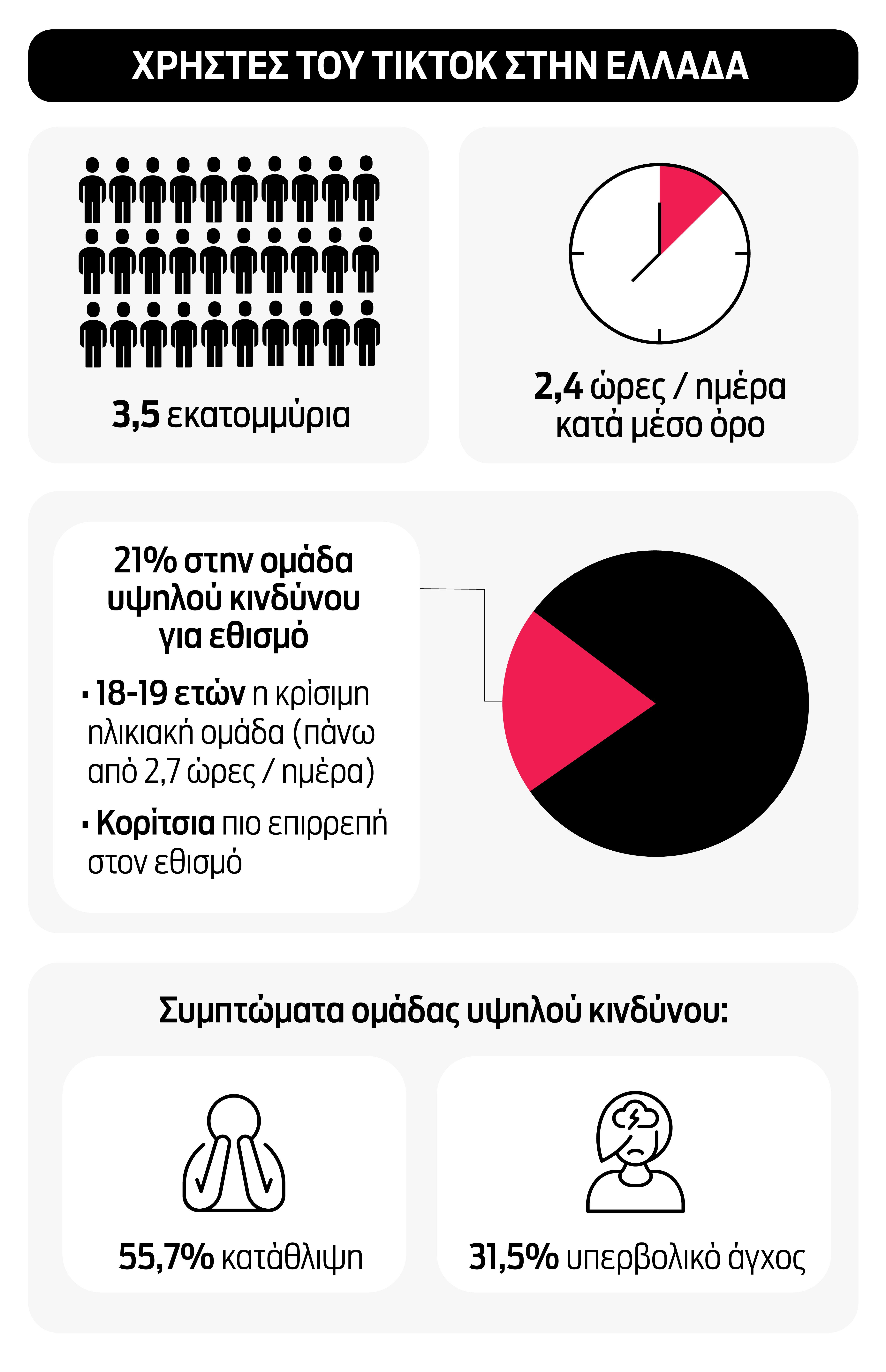 «Η κλίμακα αυτή αποτελεί μέρος μιας ευρύτερης μελέτης που διενεργεί η ομάδα μας εδώ και μερικούς μήνες για το σύνολο των μέσων κοινωνικής δικτύωσης και τη σύνδεσή τους με την ψυχική υγεία. Από τις απαντήσεις 340 συμμετεχόντων που έχουμε αναλύσει μέχρι σήμερα στην κλίμακα μέτρησης εθισμού στο TikTok, προκύπτει ότι το 21% ανήκει στην ομάδα υψηλού κινδύνου για εθισμό στην πλατφόρμα, ποσοστό εξαιρετικά ανησυχητικό», τονίζει στην «Κ» ο επίκουρος καθηγητής στο Τμήμα Νοσηλευτικής του Εθνικού και Καποδιστριακού Πανεπιστημίου Αθηνών και επικεφαλής της ομάδας, Πέτρος Γαλάνης. «Φαίνεται ότι η προβληματική χρήση του συγκεκριμένου Μέσου είναι μεγαλύτερη από ό,τι φανταζόμασταν. Το γεγονός, ωστόσο, ότι για πρώτη φορά στην Ελλάδα αποκτούμε δεδομένα ειδικά για το TikTok θα μας βοηθήσει σημαντικά να καθορίσουμε την έκταση του προβλήματος και να εντοπίσουμε τις ομάδες υψηλού κινδύνου να εμφανίσουν εθισμό», σημειώνει ο ίδιος.