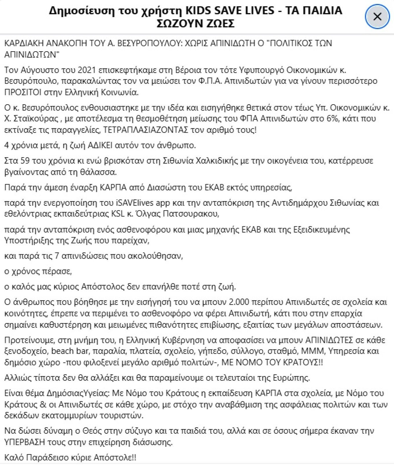 Η ομάδα αναφέρει πως το 2021 είχε παρακαλέσει τον κ. Βεσυρόπουλο να μειώσει τον ΦΠΑ στην αγορά απινιδωτών, ώστε να γίνουν προσιτοί για την κοινωνία. Ο τότε υφυπουργός Οικονομικών είχε ανταποκριθεί άμεσα και εισηγήθηκε τη συγκεκριμένη παράκληση στον πρώην υπουργό Οικονομικών, Χρήστο Σταϊκούρα, με αποτέλεσμα τη θεσμοθέτηση μείωσης του ΦΠΑ απινιδωτών στο 6%.