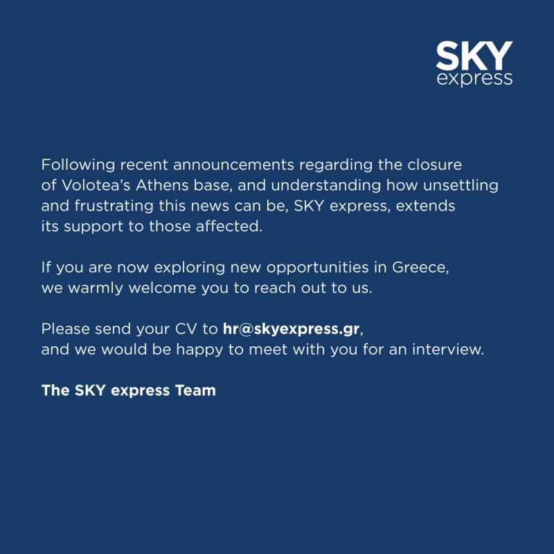 Συγκεκριμένα αναφέρει: «Μετά τις πρόσφατες ανακοινώσεις σχετικά με το κλείσιμο της βάσης της Volotea στην Αθήνα και κατανοώντας την ανησυχία και την απογοήτευση αυτής της είδησης, η Sky Express εκφράζει την υποστήριξή της στους πληγέντες. Εάν θέλετε να γνωρίσετε νέες ευκαιρίες στην Ελλάδα, σας προσκαλούμε να επικοινωνήσετε μαζί μας. Στείλτε το βιογραφικό σας στο [email protected] και θα χαρούμε να πραγματοποιήσουμε μια συνέντευξη.»