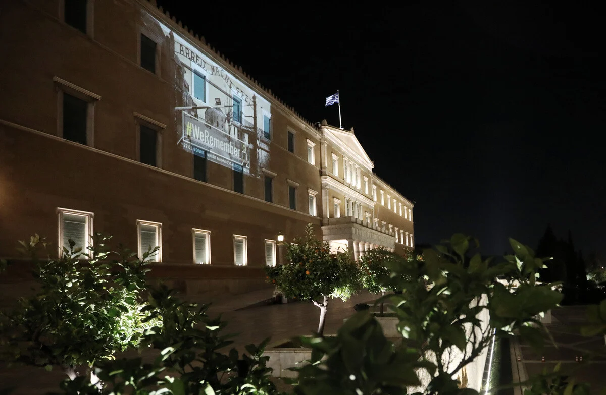 Με το σύνθημα #WE REMEMBER, της Διεθνούς Εκστρατείας για τη Μνήμη του Ολοκαυτώματος, φωταγωγήθηκε την Κυριακή η πρόσοψη του Μεγάρου της Βουλής των Ελλήνων, μία ημέρα πριν από τη Διεθνή Ημέρα Μνήμης του Ολοκαυτώματος, όπως έχει καθιερωθεί η 27η Ιανουαρίου.