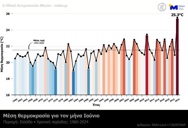 Όσον αφορά την τάση της μέσης θερμοκρασίας στην Ελλάδα από το 1960 μέχρι και το 2024 για την περίοδο του Ιουνίου αυτή παρουσιάζει άνοδο κατά 2.5°C.