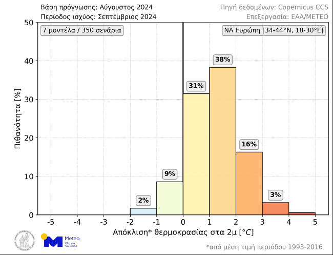 Πιο συγκεκριμένα, τα πιθανότερα σενάρια δεν σημειώνονται αποκλίσεις της τάξης των 1-2°C (38%) και 0-1°C (31%), ενώ η πιθανότητα για μέσες θερμοκρασιακές αποκλίσεις άνω των 2°C είναι περίπου 19%. Τέλος, υπάρχει 11% πιθανότητα να έχουμε χαμηλότερη της κανονικής μέσης θερμοκρασίας.