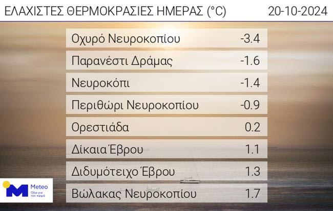 Στον σχετικό πίνακα παρουσιάζονται οι 8 σταθμοί του δικτύου αυτόματων μετεωρολογικών σταθμών του meteo.gr /Εθνικού Αστεροσκοπείου Αθηνών που κατέγραψαν τις χαμηλότερες θερμοκρασίες την Κυριακή 20/10.