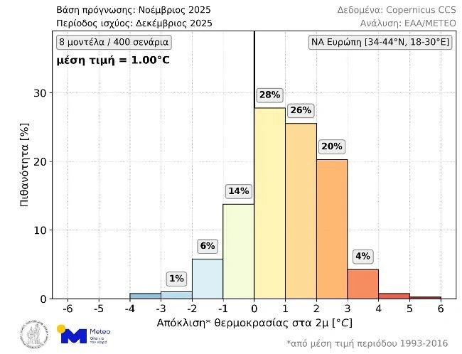 Όπως φαίνεται στο γράφημα του meteo.gr σύμφωνα με το 78,5% των διαθέσιμων σεναρίων η μέση θερμοκρασία Δεκεμβρίου θα είναι υψηλότερη από τα κανονικά για την εποχή επίπεδα (περίοδος αναφοράς: 1993-2016). Συγκεκριμένα, η πιθανότητα για θετικές αποκλίσεις μεταξύ 0 και 1°C, μεταξύ 1 και 2°C και άνω των 2°C είναι 28%, 26% και 24.5% αντίστοιχα. Οι πιθανότητες για αρνητικές αποκλίσεις μεταξύ 0 και 1°C και άνω του 1°C είναι 14% και 7,5% αντίστοιχα. Η μέση τιμή των 400 σεναρίων είναι +1.0°C.