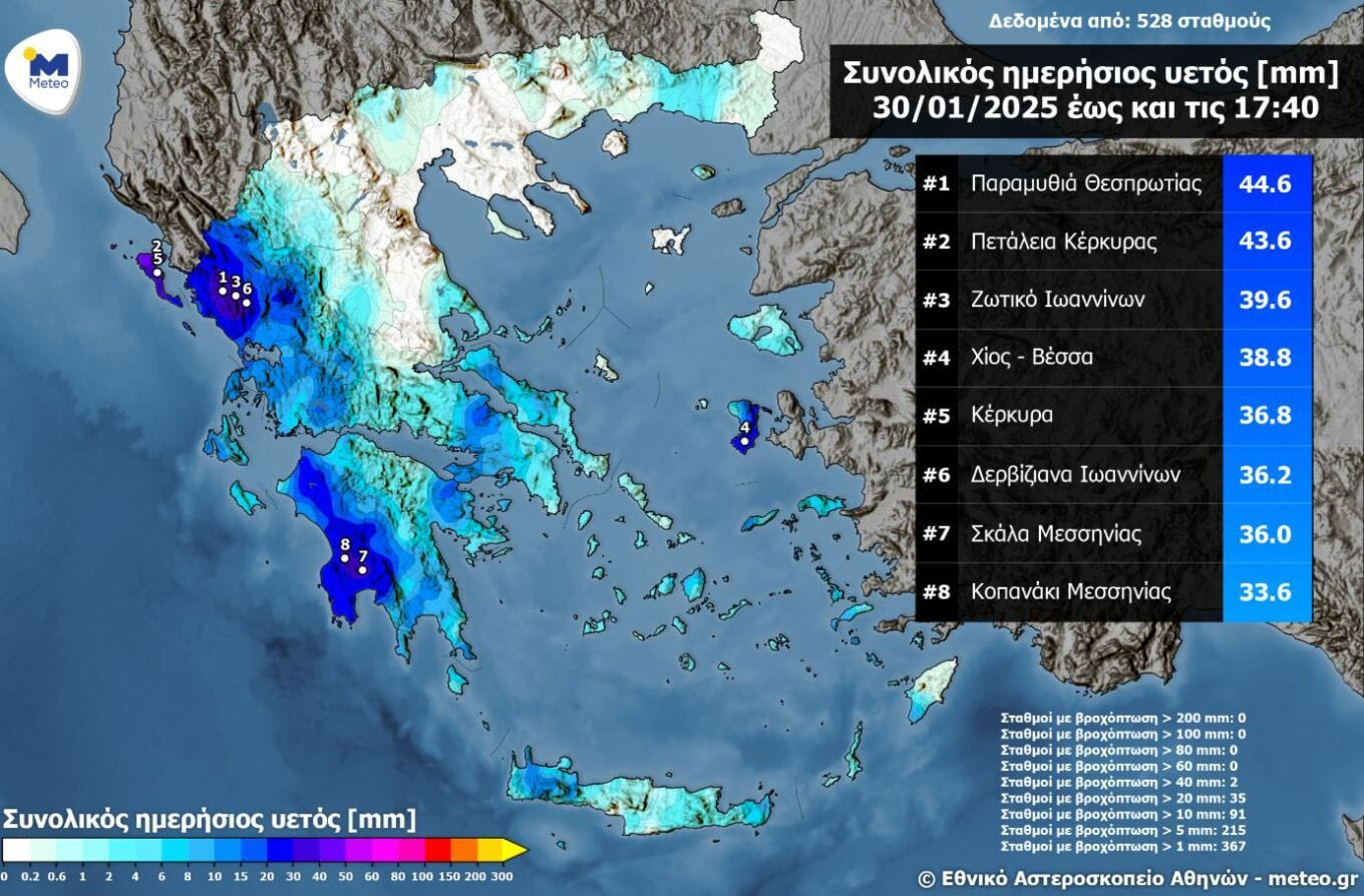 Στον χάρτη της εικόνας που ακολουθεί παρουσιάζεται η κατανομή του υετού έως τις 17:40 της Πέμπτης 30/01 καθώς και οι 8 σταθμοί με τα μεγαλύτερα ύψη. Το μεγαλύτερο ύψος υετού καταγράφηκε στην Παραμυθιά Θεσπρωτίας (44.6 χιλιοστά) και ακολούθησαν η Πετάλεια Κέρκυρας (43.6 χιλιοστά) και το Ζωτικό Ιωαννίνων (39.6 χιλιοστά).