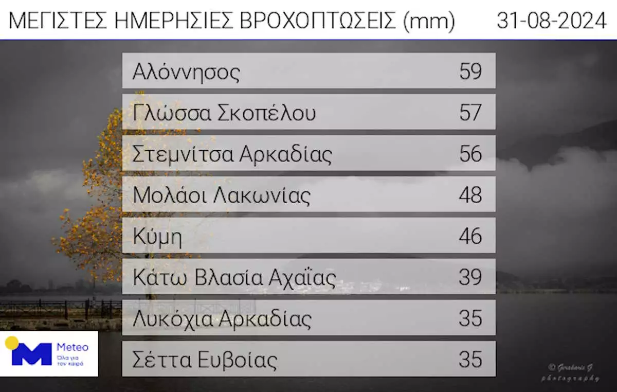 «Σημαντικές βροχές και καταιγίδες εκδηλώθηκαν το Σάββατο 31/08, κυρίως στις Σποράδες, στην Εύβοια και στην Πελοπόννησο. Σύμφωνα με τις καταγραφές του δικτύου αυτόματων μετεωρολογικών σταθμών του meteo.gr / Εθνικού Αστεροσκοπείου Αθηνών το μεγαλύτερο αθροιστικό ύψος υετού, έως τις 18:00 περίπου, καταγράφηκε στην Αλόννησο και ήταν ίσο με 59 χιλιοστά. Στον σχετικό πίνακα παρουσιάζονται οι 8 σταθμοί του δικτύου που κατέγραψαν τα μεγαλύτερα ύψη βροχής έως τις 18:00 περίπου του Σαββάτου 31/08».