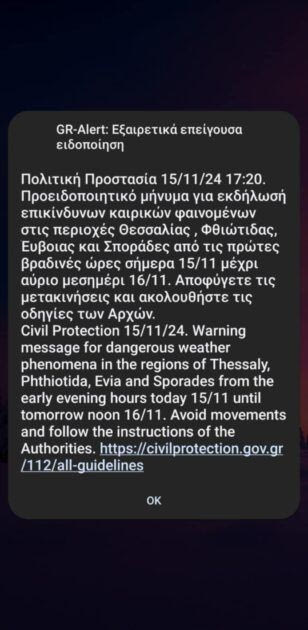 Ήχησε το 112 στις 17:23 για τους κατοίκους της Θεσσαλίας, της Φθιώτιδας, Εύβοιας και των Βόρειων Σπράδων λόγω της κακοκαιρίας Alexandros