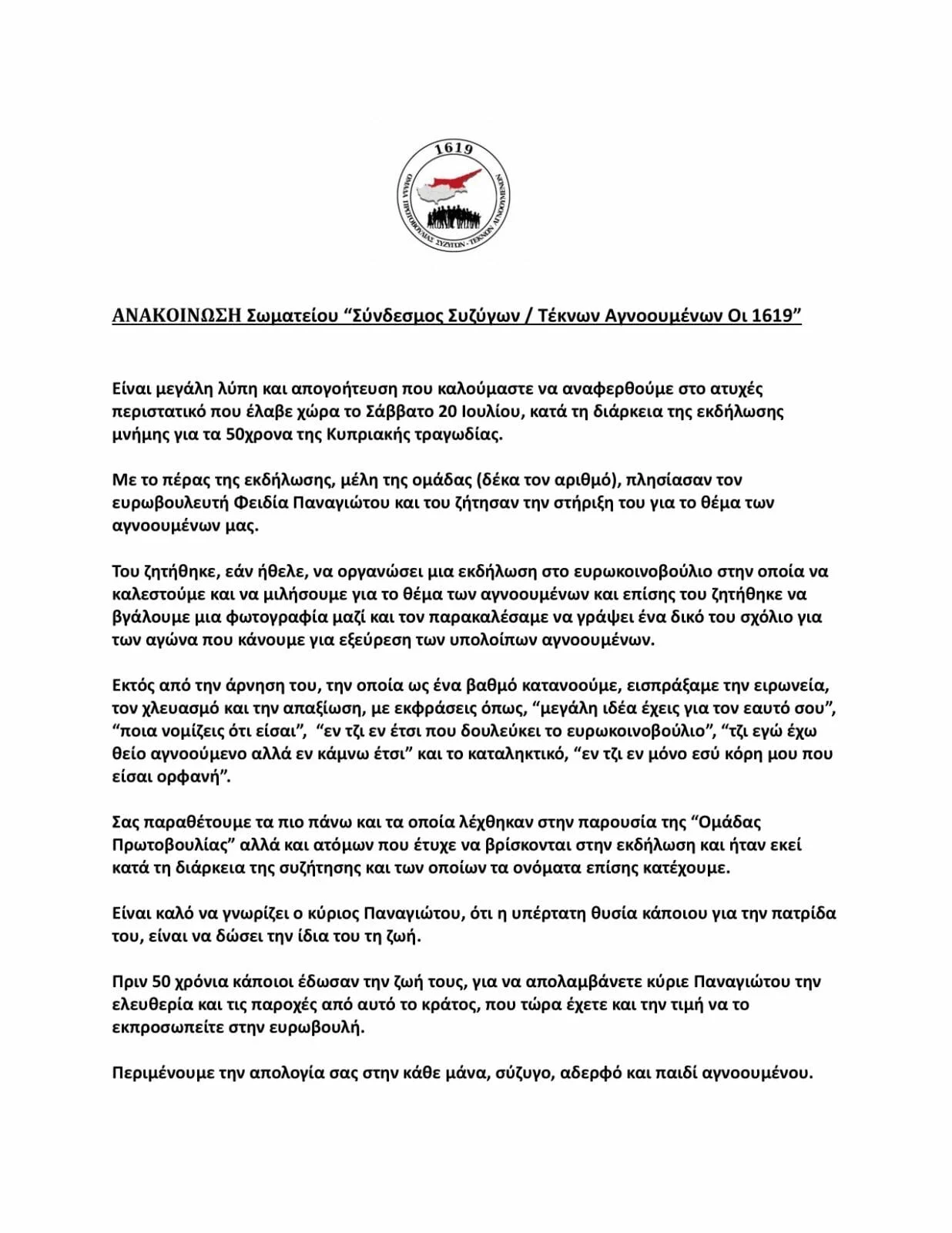 «Με λύπη και απογοήτευση αναγκαζόμαστε να αναφερθούμε σε ένα ατυχές περιστατικό που συνέβη το Σάββατο 20 Ιουλίου, κατά τη διάρκεια της εκδήλωσης μνήμης για τα 50 χρόνια από την Κυπριακή τραγωδία. Μετά την εκδήλωση, μέλη της ομάδας (δέκα στον αριθμό) πλησίασαν τον ευρωβουλευτή Φειδία Παναγιώτου ζητώντας την υποστήριξή του για το ζήτημα των αγνοουμένων μας», αναφέρεται στην ανακοίνωση.