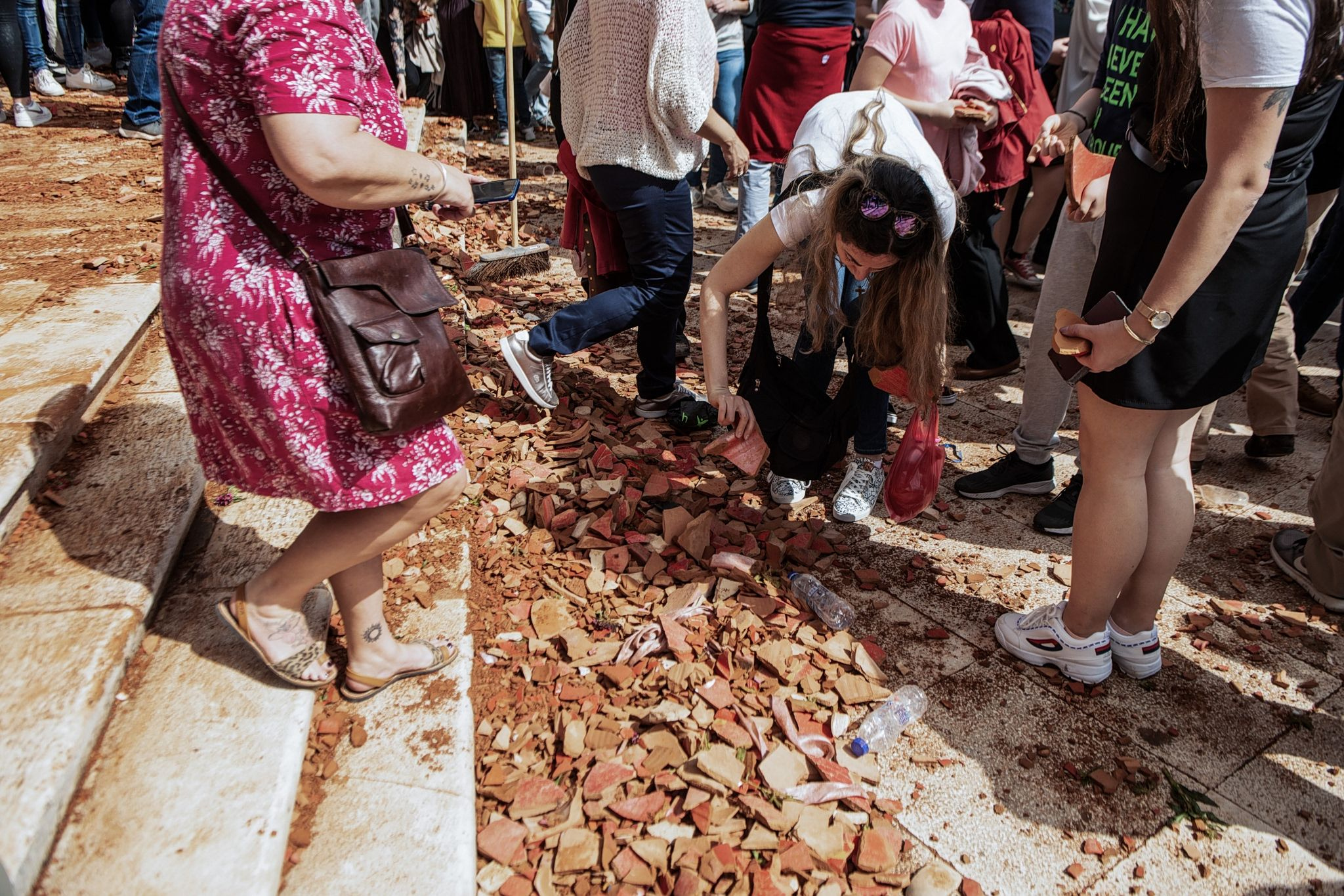 Μια κοπέλα σηκώνει κομμάτι από του σπασμένους μπότηδες, που σύμφωνα με την παράδοση θεωρείται «καλή τύχη»