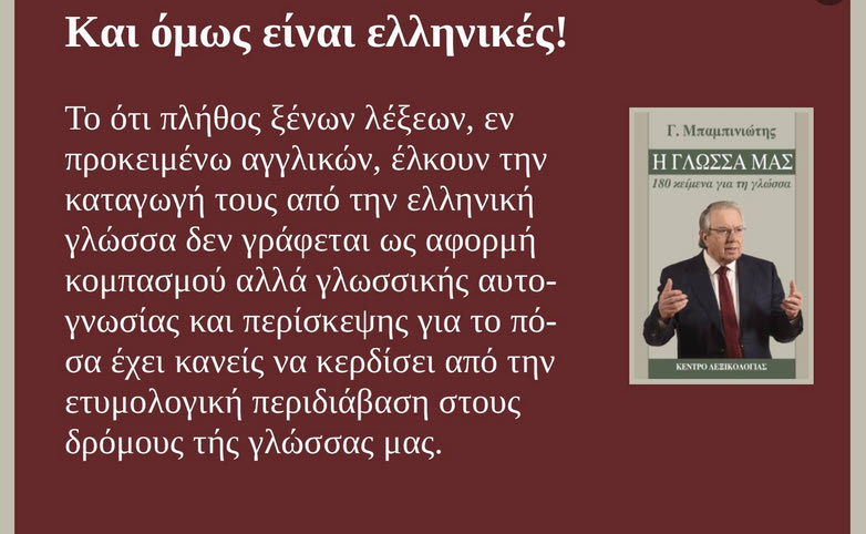 Κι όμως είναι ελληνικές, αναφωνεί ο Μπαμπινιώτης! Την ετυμολογική προέλευση λέξεων της σύγχρονης αγγλικής γλώσσας οι οποίες, σε μια πρώτη ανάλυση- ανάγνωση, δείχνουν ότι δεν είναι ελληνικές αναλύει ο καθηγητής Γλωσσολογίας και πρώην πρύτανης του Πανεπιστημίου Αθηνών, Γιώργος Μπαμπινιώτης.