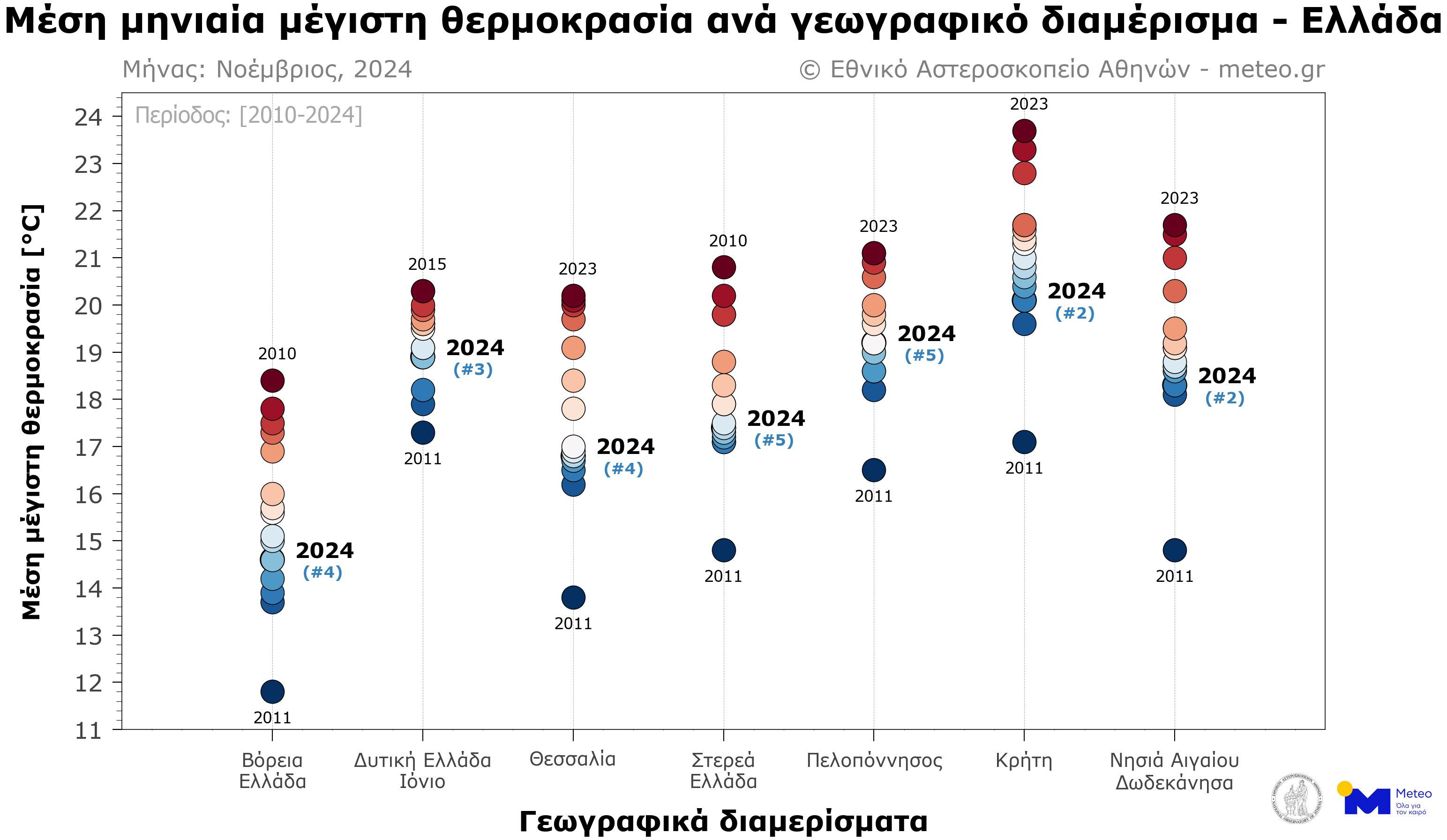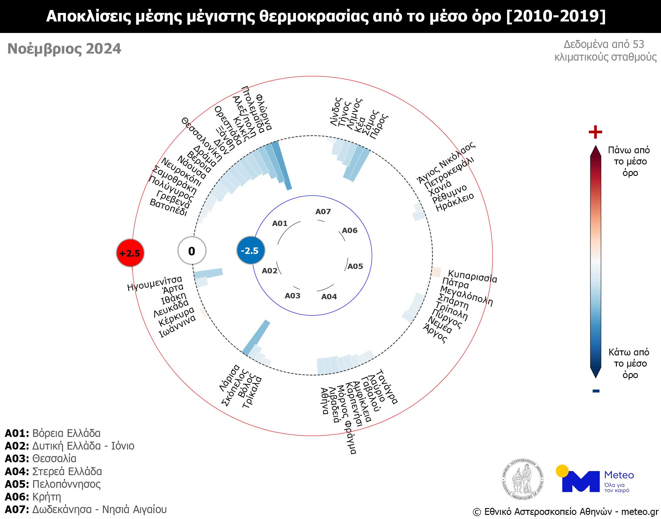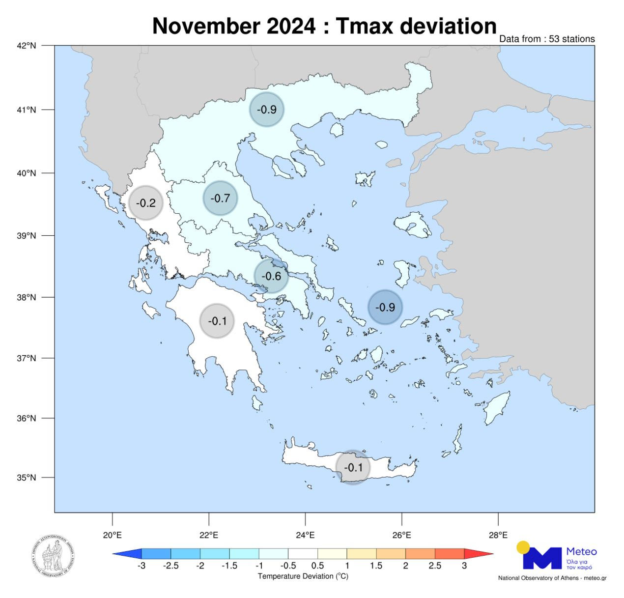 Αξίζει να σημειωθεί πως για την Κρήτη ο Νοέμβριος του 2024 είναι ο πρώτος μήνας που καταγράφηκε με θερμοκρασίες κάτω από τη μέση τιμή της περιόδου 2010-2019, ύστερα από 16 συνεχόμενους μήνες με θετικές αποκλίσεις (από τον Ιούλιο 2023).