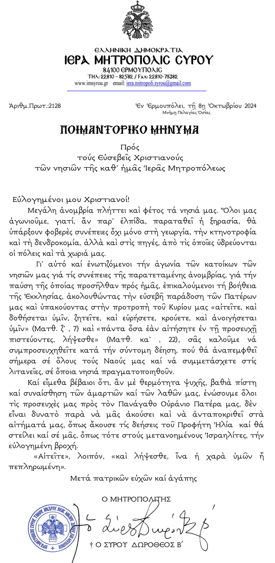 Δείτε την εγκύκλιο της Μητρόπολης Σύρου για λιτανείες και δεήσεις για την ανομβρία