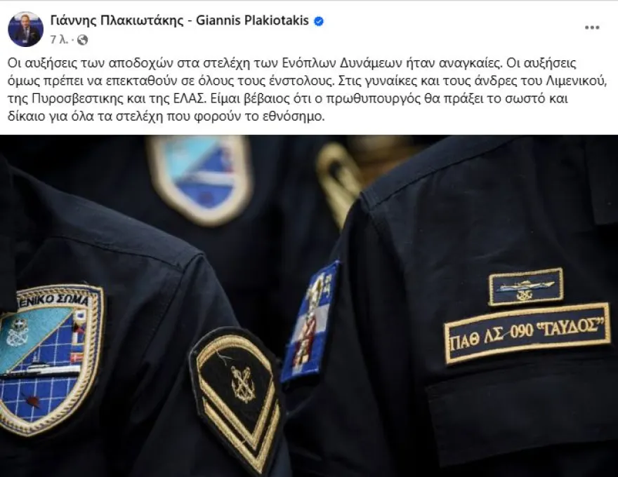 «Οι αυξήσεις πρέπει να επεκταθούν σε όλους τους ένστολους» έγραψε σε δική του ανάρτηση ο Α΄ αντιπρόεδρος της Βουλής και υπουργός Ναυτιλίας, Γιάννης Πλακιωτάκης.