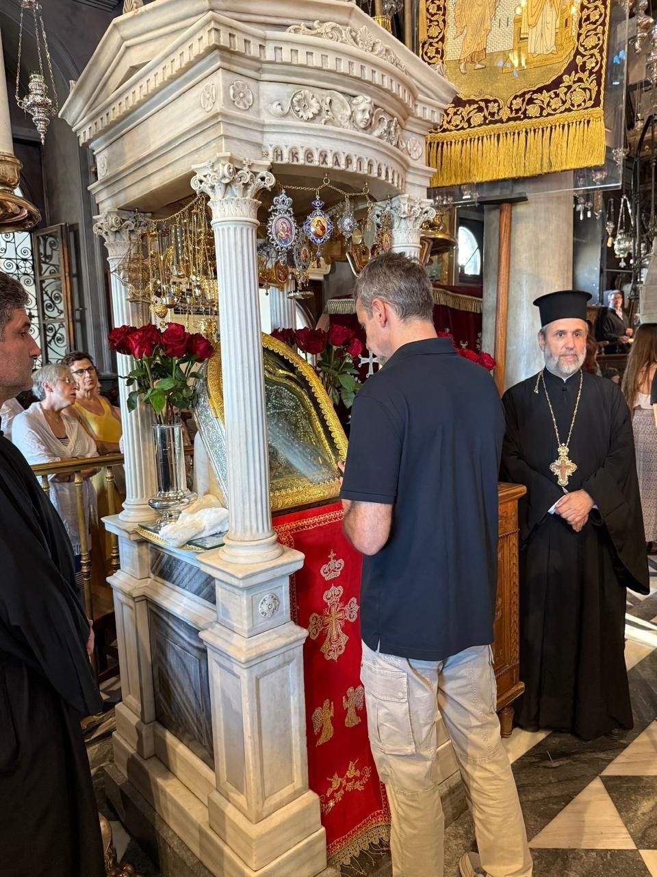 Ετσι, δεκάδες πιστοί που βρίσκονταν στην Παναγία είδαν ανάμεσά τους τον «Νόλε» και τον κ. Μητσοτάκη να περιμένουν να ανάψουν κερί και να προσκυνήσουν τη θαυματουργή εικόνα.