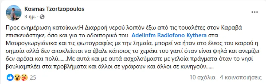 «Προς ενημέρωση κατοίκων: Η Διαρροή νερού λοιπόν έξω από τις τουαλέτες στον Καραβά επισκευάστηκε, όσο και για το οδοιπορικό του Adelinfm Radiofono Kythera στα Μαυρογιωργιάνικα και τις φωτογραφίες με την Σημαία, μπορεί να ήταν στο έλεος του καιρού η σημαία αλλά δεν αποκλείεται να έβαλε κάποιος το χεράκι του γιατί όταν είναι ψηλά και ανεμίζει δεν αρέσει και πολύ…….Με αυτά και με αυτά ασχολούμαστε με γελοία πράγματα όταν το νησί βουλιαμπλέει στα προβλήματα και άλλοι σε γράφουν και άλλοι σε κυνηγούν……», έγραφε χαρακτηριστικά.