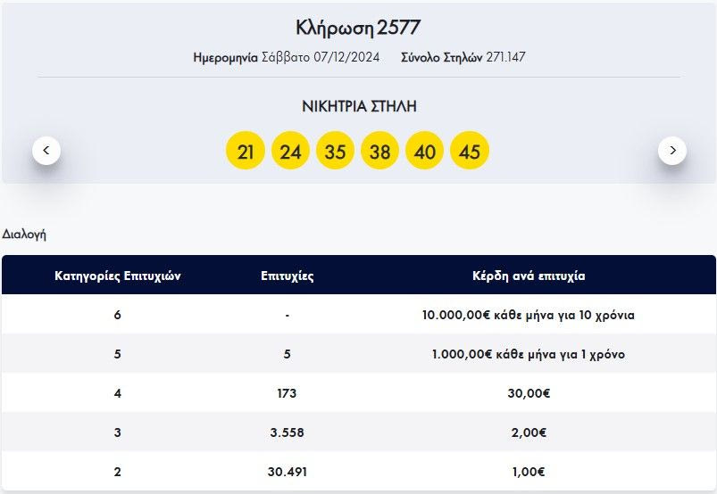 Δεν βρέθηκε νικητής στην πρώτη κατηγορία του Λόττο στην κλήρωση 2577 του Σαββάτου