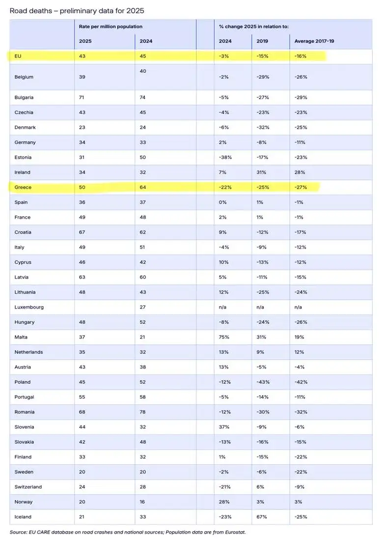 Η εξέλιξη αυτή έρχεται να επιβεβαιώσει, με επίσημα ευρωπαϊκά δεδομένα, τη σημαντική πρόοδο που καταγράφηκε το 2025, χρονιά κατά την οποία η Ελλάδα σημείωσε τη μεγαλύτερη μείωση θανάτων από τροχαία στην ιστορία της, με 517 θανάτους έναντι 665 το 2024, δηλαδή μείωση 22%. Ο αριθμός αυτός είναι ταυτόχρονα και ο χαμηλότερος από το 1963 για τη χώρα μας.