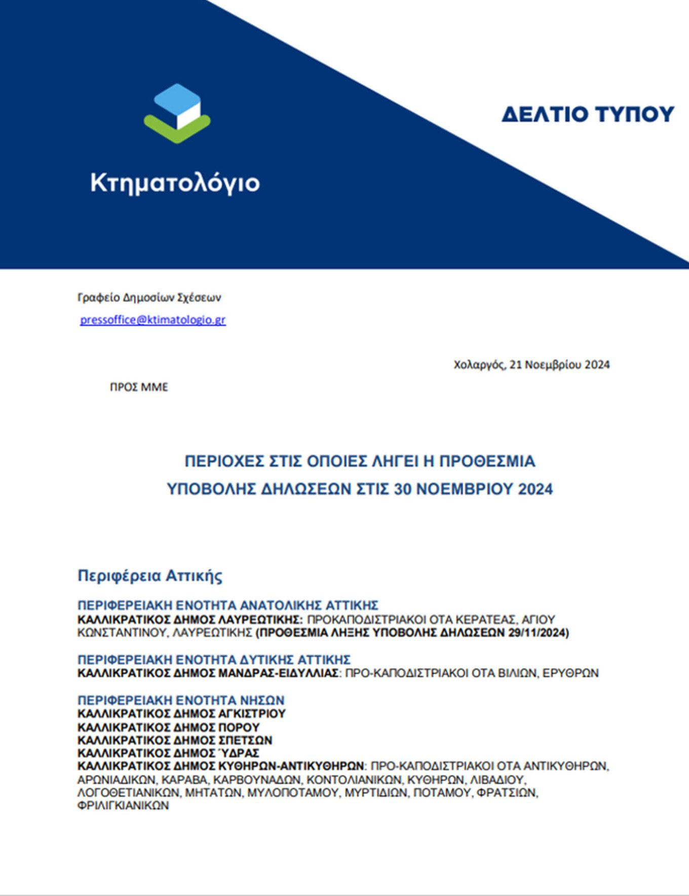 Οι περιοχές που λήγει στις 30 Νοεμβρίου η προθεσμία υποβολής δηλώσεων ιδιοκτησίας