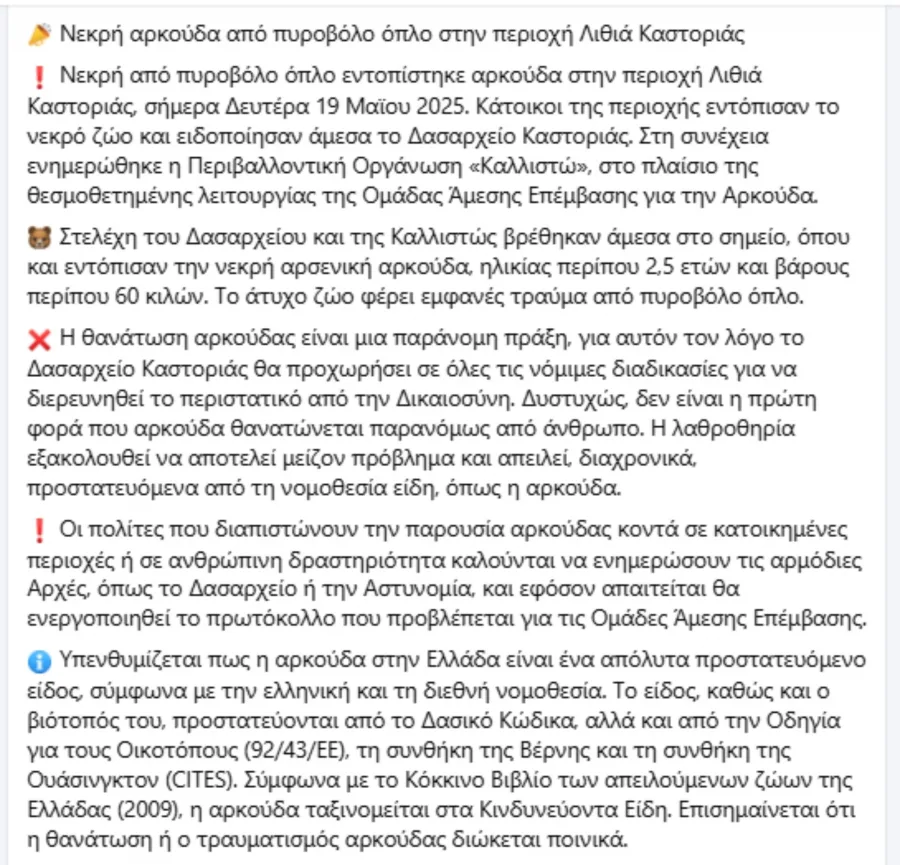 Η οργάνωση «Καλλιστώ» υπογράμμισε την παράνομη πράξη για τη θανάτωση της αρκούδας, ενώ το Δασαρχείο Καστοριάς θα προχωρήσει σε όλες τις νόμιμες διαδικασίες για να διερευνηθεί το περιστατικό από τη Δικαιοσύνη.