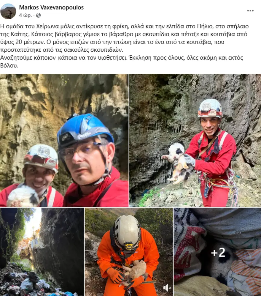 «Κάποιος βάρβαρος γέμισε το βάραθρο με σκουπίδια και πέταξε και κουτάβια από ύψος 20 μέτρων. Ο μόνος επιζών από την πτώση είναι το ένα από τα κουτάβια, που προστατεύτηκε από τις σακούλες σκουπιδιών. Αναζητούμε κάποιον-κάποια να τον υιοθετήσει. Έκκληση προς όλους, όλες ακόμη και εκτός Βόλου», αναφέρει και συνοδεύει την ανάρτηση από φωτογραφίες και βίντεο από το σπήλαιο και τη διάσωση του κουταβιού.