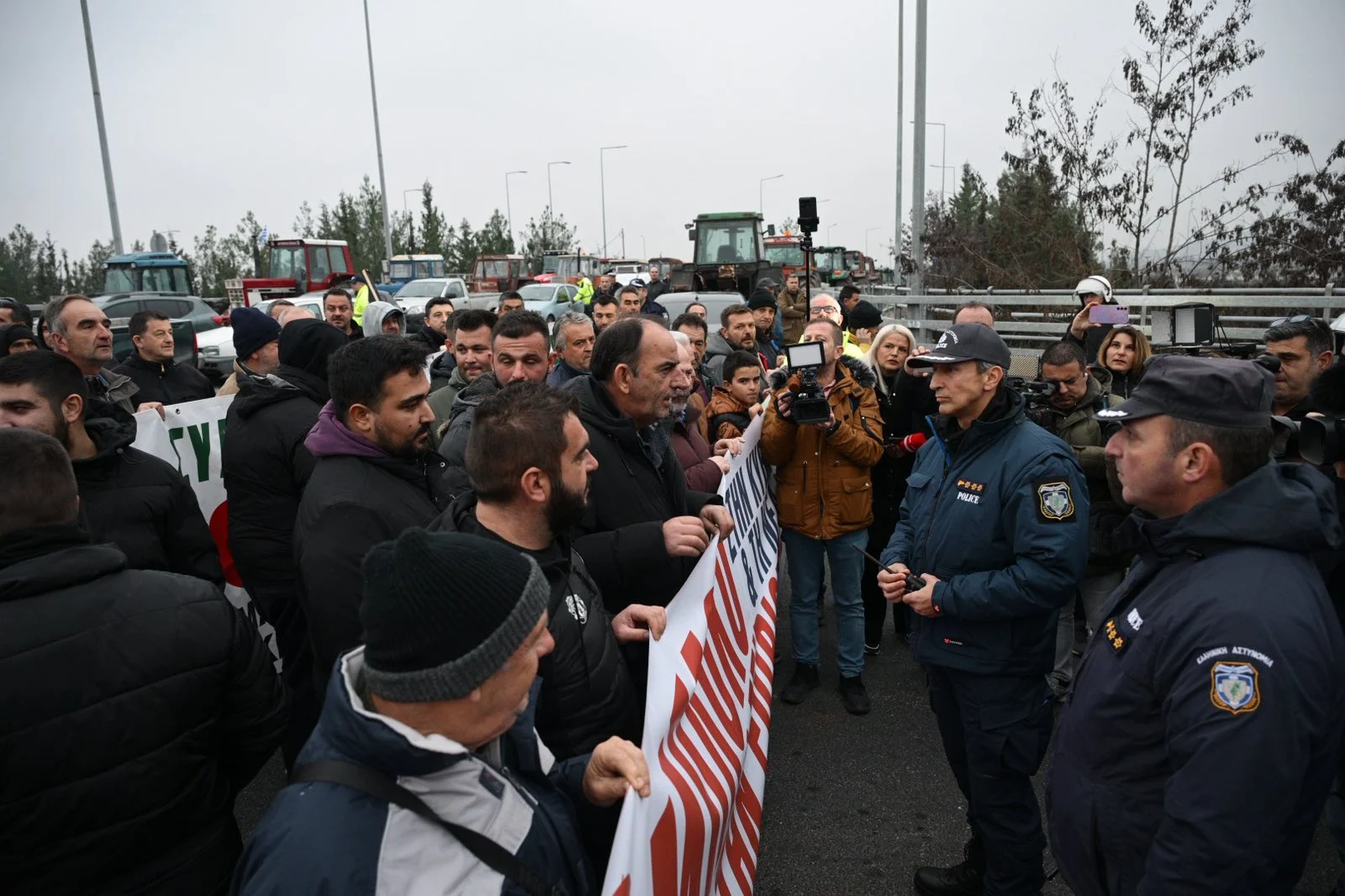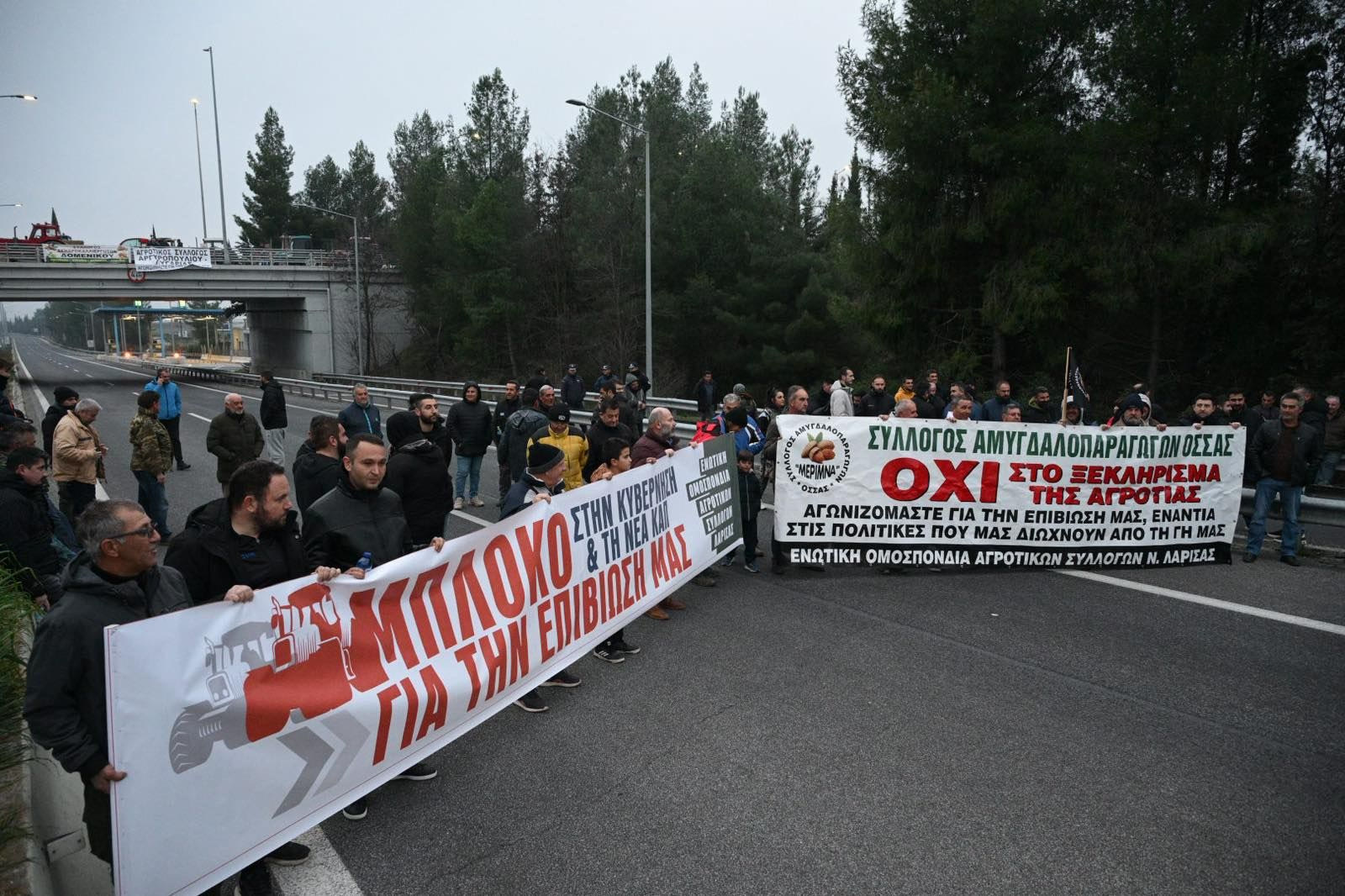 Οι αγρότες κατέβηκαν με τα πόδια στην Εθνική Οδό, χωρίς τα αγροτικά τους μηχανήματα, με την κυκλοφορία να διακόπτεται για μία ώρα.