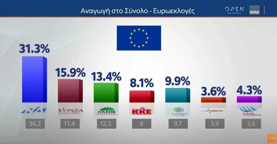 Ειδικότερα, στην εκτίμηση ψήφου (αναγωγή στο σύνολο για ευρωεκλογές) η Νέα Δημοκρατία καταγράφει ποσοστό 31,3% (από 36,2%) δηλαδή χάνει 4,9%, ο ΣΥΡΙΖΑ 15,9% (από 11,4%) κερδίζει 4.5% και το ΠΑΣΟΚ είναι τρίτο κόμα με 13,4% (από 12,5%) κερδίζει δηλαδή 0,9%.