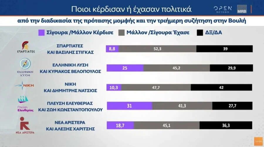 - Ελληνική Λύση: Σίγουρα/Μάλλον κέρδισε 25 – Μάλλον/Σίγουρα έχασε 45,2 – Δεν ξέρω/Δεν απαντώ 29,9