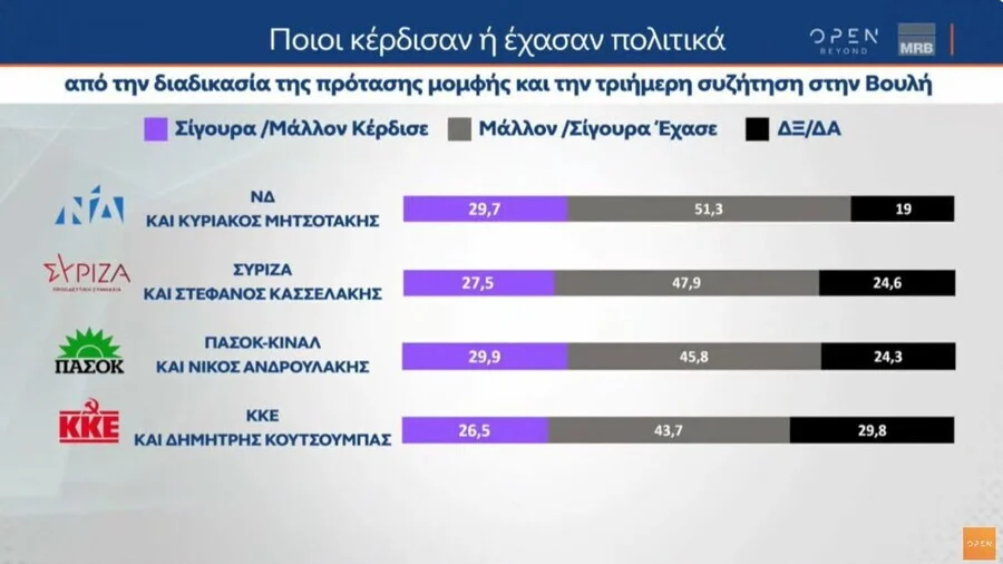 - ΝΔ: Σίγουρα/Μάλλον κέρδισε 29,7 – Μάλλον/Σίγουρα έχασε 51,3 – Δεν ξέρω/Δεν απαντώ 19